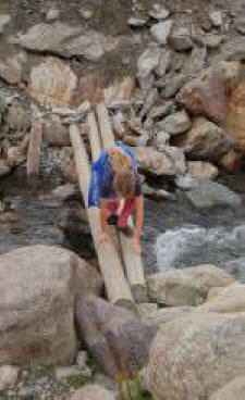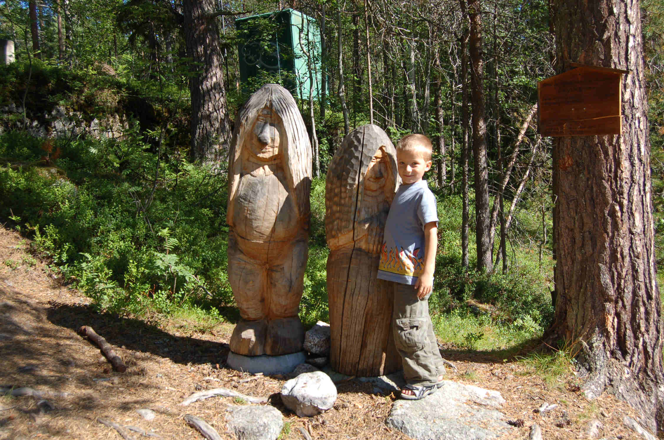 10.08.07 Nach wunderbar ruhiger Nacht werden wir, - ganz gegen unseren sonstigen Rhythmus erst um 08.30 Uhr wach. Die Kinder spielen nach dem Frühstück noch ein wenig auf den Felsen am Fluss, während wir das Geschirr spülen und einige Urlaubskarten schreiben. Gegen 10.00 Uhr brechen wir auf Richtung Dorotea. Zuerst dachten wir, wir fahren nochmals quer rüber und nicht über Vilhelmina. Dann brechen wir jedoch nach ca. 10 km ab und kehren um, die Vorstellung noch weitere 60 km auf einer Naturstraße fahren zu müssen, schreckt mich dann doch ab und wir fahren auf einer asphaltierten Alternative bis Dorotea. In Vilhelmina besichtigen wir nach Tanken und Mittagessen die Kirchenstadt und dann begehen wir den Sagastig am Kirchberg. Die Jungs sind so begeistert, dass sie mit Heike auch noch den 2. Rundweg (rote Markierung 2,5 km) Naturstig begehen. Es sind Wurzelwege und das gefällt den Jungs.