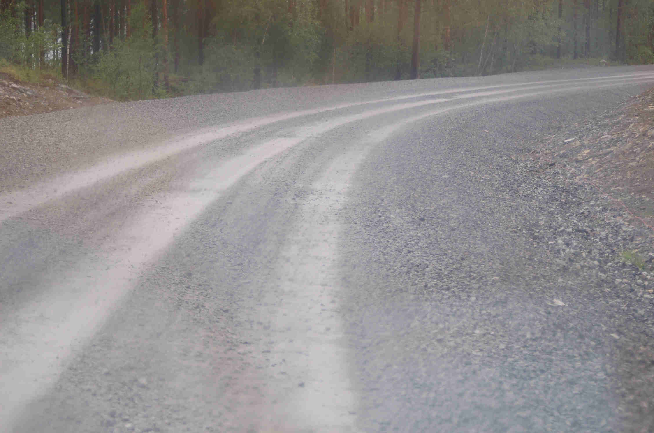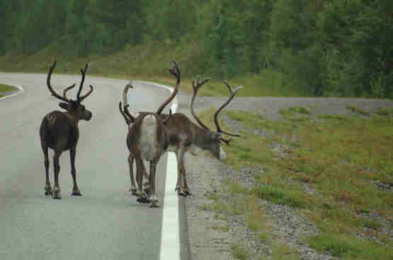 Wir ahnen nicht, dass uns insgesamt über 35 km "Naturstrasse" bzw. Baustellenschotterpiste bevorstehen. Über viele Kilometer ist die Strasse eine einzige Baustelle und mit losem Schotter bedeckt. Über 10 km müssen wir sogar wegen des losen Schotters im 1. Gang fahren, den Rest im 2. oder 3. Mich als Fahrer entschädigen die zahlreichen Rentiere und anderen Tiere, die wir am Wegesrand und z.T. auf der Straße sehen nur bedingt.