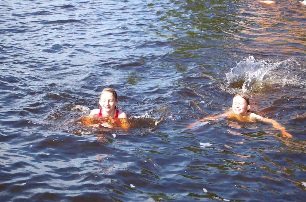Nach dem Museumsbesuch gegen 17.00 Uhr sind wir alle hungrig, außer einigen trockenen Scheiben Brot und Sprudel hatten wir nichts zu essen mitgenommen. Wir machen uns auf die Suche nach einem Supermarkt, den wir an der Ausfallstraße nach Sundsvall schließlich finden. Nachdem wir unsere Vorräte aufgefüllt haben, erreichen wir gegen 18.00 Uhr unseren Stellplatz von letzter Nacht. Alle, außer Birgit, die sich am Morgen an einer Glasscherbe den Fuß aufgeschnitten hat, nehmen ein kurzes Bad im schneidend kalten Wasser des kältesten Sees Schwedens. (lt. Reisführer).