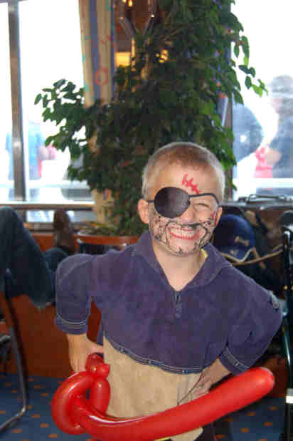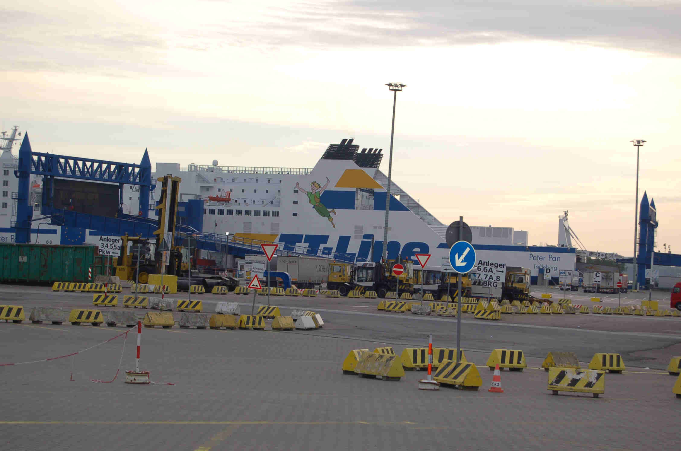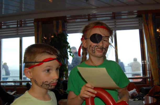 Um 6.00 Uhr werden wir vom Krach im Hafen wieder wach, um 7.00 Uhr stehen wir auf und frühstücken. Wir sitzen noch beim Kaffee, als eine Mitarbeiterin der TT-Line uns bittet einzuchecken. Wir fahren durch die Kontrolle, um 500 m später wieder anzuhalten und die nächste Schlange zu beginnen. Nun trinken wir unseren Kaffee und die Kids fangen an zu nerven, mit "wann geht es endlich auf die Fähre?". Schlag auf Schlag kommen nun Wohnmobile, Wohnwagen und Pkw. 1 Stunde später geht es 1 km weiter, bis kurz vor die Fähre, die Verladung beginnt. Wir müssen nochmals ca. 20 min warten, bis auch wir auf die Fähre fahren dürfen. Das Boot wird voll bis zum letzten Platz, aber wir starten pünktlich um 10.00 Uhr. Die Kinder, zumindest die 3 Kleineren gehen zur Kinderbetreuung und werden Piraten. So sind sie schon mal 1,5 Stunden beschäftigt. Am Nachmittag gibt es nochmals eine Kinderbetreuung (jetzt verschwinden alle vier Kinder, nachdem Astrids Buch auch zu Ende gelesen ist) und im Anschluss "Ice Age" im Bordkino.