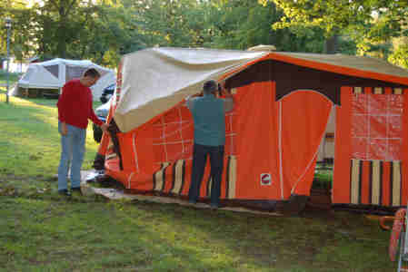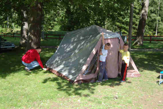 Danach bauen wir unser altes Zelt auf, als Überraschung für die Kinder, sie sollen darin schlafen. Wir sind gerade fertig, als der nächste Regenschauer kommt. Das gemütliche Kaffeetrinken müssen wir ins Vorzelt von Oma und Opa verlegen.
