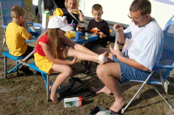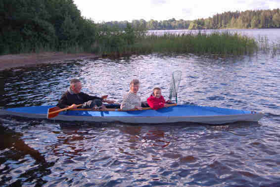 30.07.07 Um 7.00 Uhr kommen ein gutgekühlter Fabian und Birgit ins Womo in unser Bett zum Aufwärmen, bei 11 Grad wurde es ihnen dann doch kalt. Immerhin, die Sonne scheint und Opa fährt mit Marc im Paddelboot auf den Asnen-See um zu angeln. Sie schleppen einen Blinker nach, aber die Fänge bleiben aus.