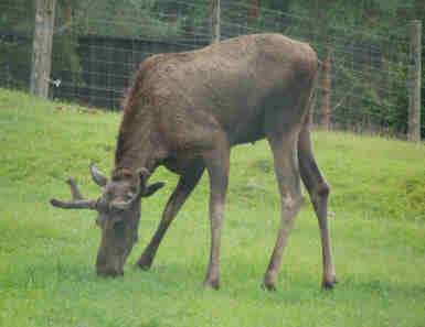 2.8.2007 Wir fahren nach dem Frühstück die Fischzuchtanlage des Freundes von Opa, von Helfried Hölke in Bälganet besichtigen. Vor 30 Jahren hatte Opa Helfried im Rahmen seines Wissens als Fischereibiologe Tipps zum Betrieb der Anlage gegeben. Opa und Oma hatten in der letzten Woche bereits eine Visitenkarte hinterlassen. Vom jetzigen Betreiber erfahren wir, dass Helfried die Anlage an ihn seit 1994 verpachtet hat und nach Deutschland zurückgekehrt ist. Er käme allerdings im Sommer noch gelegentlich zum Wildschweinjagen. Seine geschiedene Frau Melitta wohne aber noch in Ronneby. Oma und Opa rufen dort an und wir werden spontan zum Besuch eingeladen. Wir verbringen eine unterhaltsame Stunde im Garten (für die Kids allerdings eher langweilig) und fahren dann nach Urshult zurück. In Lunabakken machen wir eine schöne Wanderung, eigentlich ein Rundweg, allerdings ist das letzte Drittel vom Hochwasser überflutet und wir müssen umkehren. Trotzdem haben alle Spaß am Weg und wir können sogar den Pulli ausziehen und im T-Shirt laufen. Abends ziehen wieder Wolken auf und beim gemeinsamen Rommeespielen im Wohnwagen von Oma und Opa regnet es wieder ein wenig. 03.08.2007 Seit 7.00 Uhr regnet es wieder "Bindfäden". Wir machen unseren Ausflug ins Glasreich (ca. 60 km) und besuchen die Glasbläserei Kosta (Eintritt 20 SEK pro Erwachsener). Hier waren wir auch vor zwei Jahren, damals fast ganz allein, dieses Jahr ist Hochbetrieb, es reichen nicht einmal die zahlreichen Parkplätze. Der Besucheransturm trifft allerdings auf eine recht verwaiste Glashütte, es sind Betriebsferien und nur eine Notmannschaft macht einige wenige Schaustücke. Im Vergleich zu 2005 ist so enttäuschend wenig geboten. Nach der Besichtigung nehmen wir einen Imbiss zu uns und fahren weiter zum Elchpark (175 SEK Eintritt für alle). Während wir durch den Park stapfen, lässt der Regen nach, um schließlich ganz aufzuhören. Nachdem Astrid zunächst vermutet hatte, außerhalb des kleineren Elchgehees gäbe es keine Elche und die Elchsafari würde sicherlich scheitern, können wir am Ende des Safari-Spaziergangs doch noch einen stattlichen Elchstier entdecken.