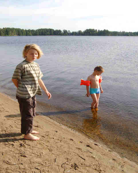4.8.07 Wir schlafen relativ lang und so ist es schon fast 10.00 Uhr, als wir uns von Oma und Opa verabschieden und losfahren. Über Växjö, Jonköping geht es zunächst zum Vättern, wo wir eine längere Mittagspause einlegen. Dann geht es über Linköping und Norrköping nach Stockholm und von dort aus weiter Richtung Uppsala. Bei unserem Nachmittagsrast an einer Schafweide wird Marc "von einer Giftschlange verfolgt.". Birgits Nachforschungen ergeben, dass sich offensichtlich tatsächlich Kreuzottern auf der Wiese auf den Steinen sonnen. Als sie uns die Schlangen zeigen möchte, sind sie jedoch verschwunden. Heike ist bis heute der Ansicht, dass es sich um Blindschleichen handelte.... Nachdem wir die Kids um 20.00 Uhr in die Betten verfrachtet haben, fahren wir noch bis ca. 22.00; es kommt uns zugute, dass es bis nach 22.00 Uhr hell ist. Schließlich übernachten wir an einer Raststätte der E 4 in Tönnebro an einem See. Zwar haben wir etwas Bedenken, da in Deutschland vor dem Übernachten an Parkplätzen an den Autobahnen (zumindest an der E 6) gewarnt wird wegen Überfällen, allerdings stehen hier ca. 10 Wohnmobile und 5 Wohnwagen so dass wir das Wagnis eingehen. Wir verbringen eine ruhige Nacht. Morgens spielen die Kids noch am See, so dass wir wieder erst um 9.30 Uhr starten.