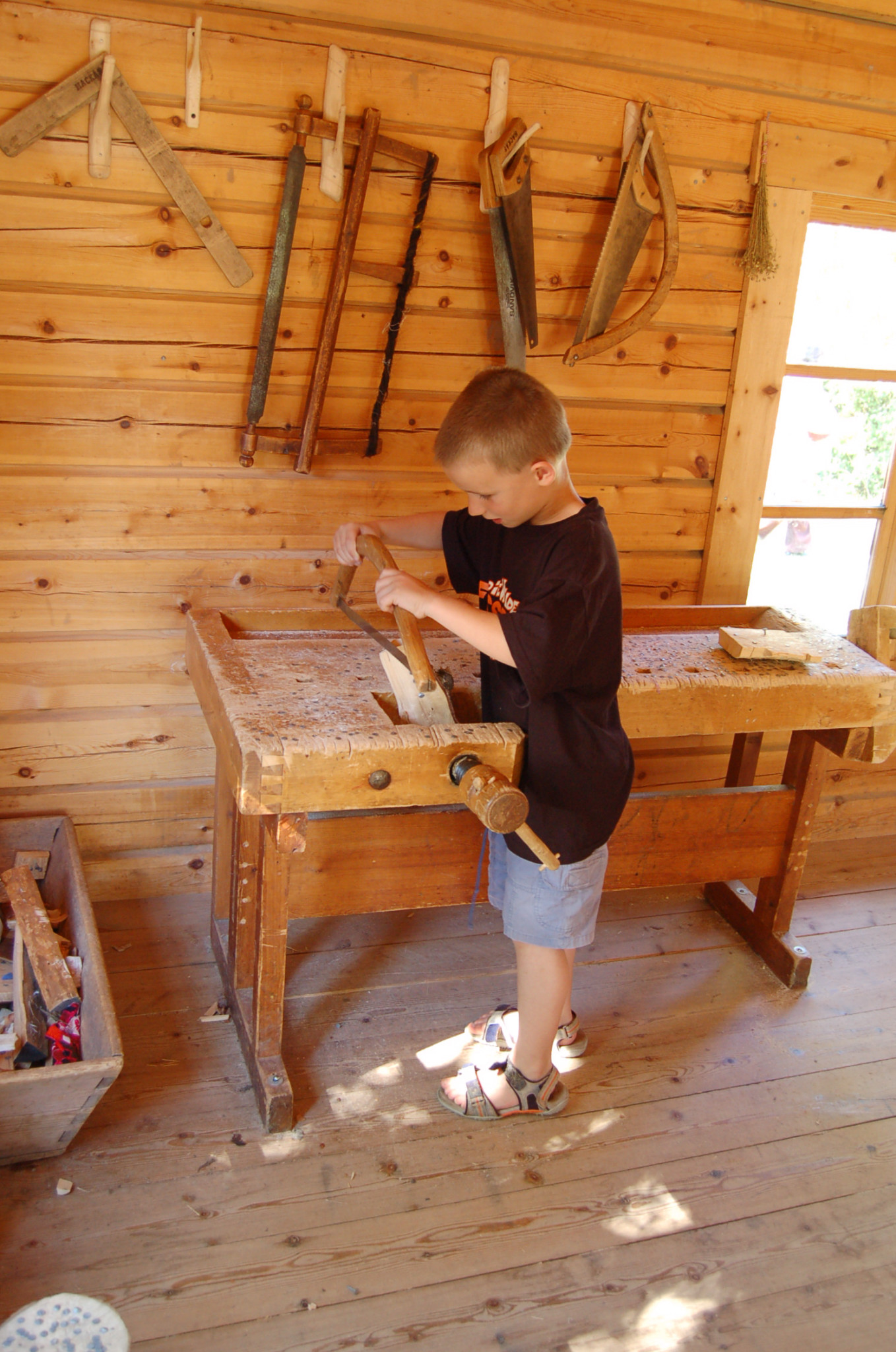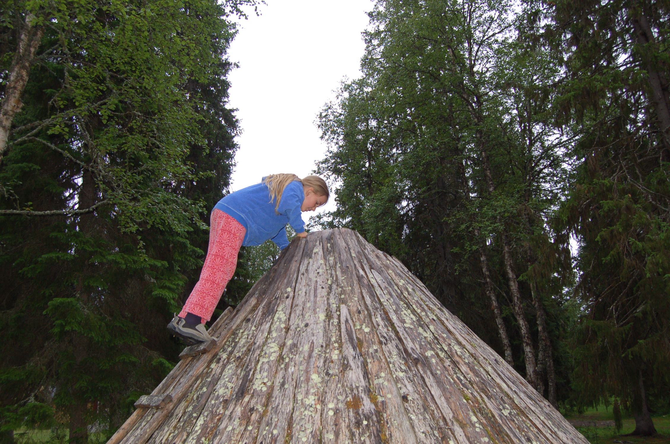 Das wichtigste und bedeutendste Ausstellungsstück ist der Bildteppich von Överhogdal aus dem 12. Jhdt. Es ist der einzig erhaltene Wikingerbildteppich. Fabian und Heike hören alle drei möglichen Deutungen der Darstellungen an und sehen sich dabei die Teppichstücke intensiv an. Die drei möglichen Darstellungen: Götterdämmerung, Sigurdsage (Sigurd, der Drachentöter, kommt uns sehr bekannt vor - Nibelungensage) oder Christianisierung. Alles wird spannend erzählt und wir sehen uns auch die anderen Ausstellungsteile sehr gerne an, nur leider konnten wir nur einen Bruchteil der spannenden Geschichten anhören. Neben der großen Wikingerausstellung gibt es noch eine Sami-Ausstellung nach dem Jahreslauf der Rentierzüge, einen Teil über die Steinzeit, das bäuerliche Schweden im 16. - 18. Jhdt., Feste bei den Schweden und den Sami, Marktbauern und vieles andere. Da das gesamte Historieland aber um 17 Uhr schon wieder schließt und es heute sehr schönes Wetter ist, beschließen wir, zur Außenausstellung überzugehen. Dort finden sich viele alte nachgebaute und "übergesiedelte" Häuser in einem historischen Freiluftmuseum, das z.T. bewirtschaftet wird. Wir sehen u.a. den Marktplatz von Östersund aus dem Jahr 1895 mit einigen historischen Nachbauten, eine Shelltankstelle aus den 50er Jahren, eine Molkerei, ein Sommerlager für Kinder im Jahr 1942, den Hof eines reichen Bauers, der zugleich Polizist war, aus dem Jahr 1875 und viele Kinderattraktionen. Leider reicht hier der Platz nicht, um alles genau zu beschreiben, außerdem wollen wir Euch ja nicht langweilen. Die Kinder sind begeistert von den Tieren, dem Kinderkraftwerk, der Molkerei, der Flößerei und den vielen Spielmöglichkeiten.