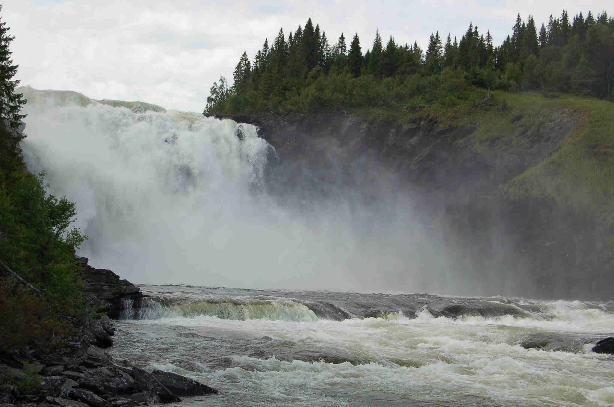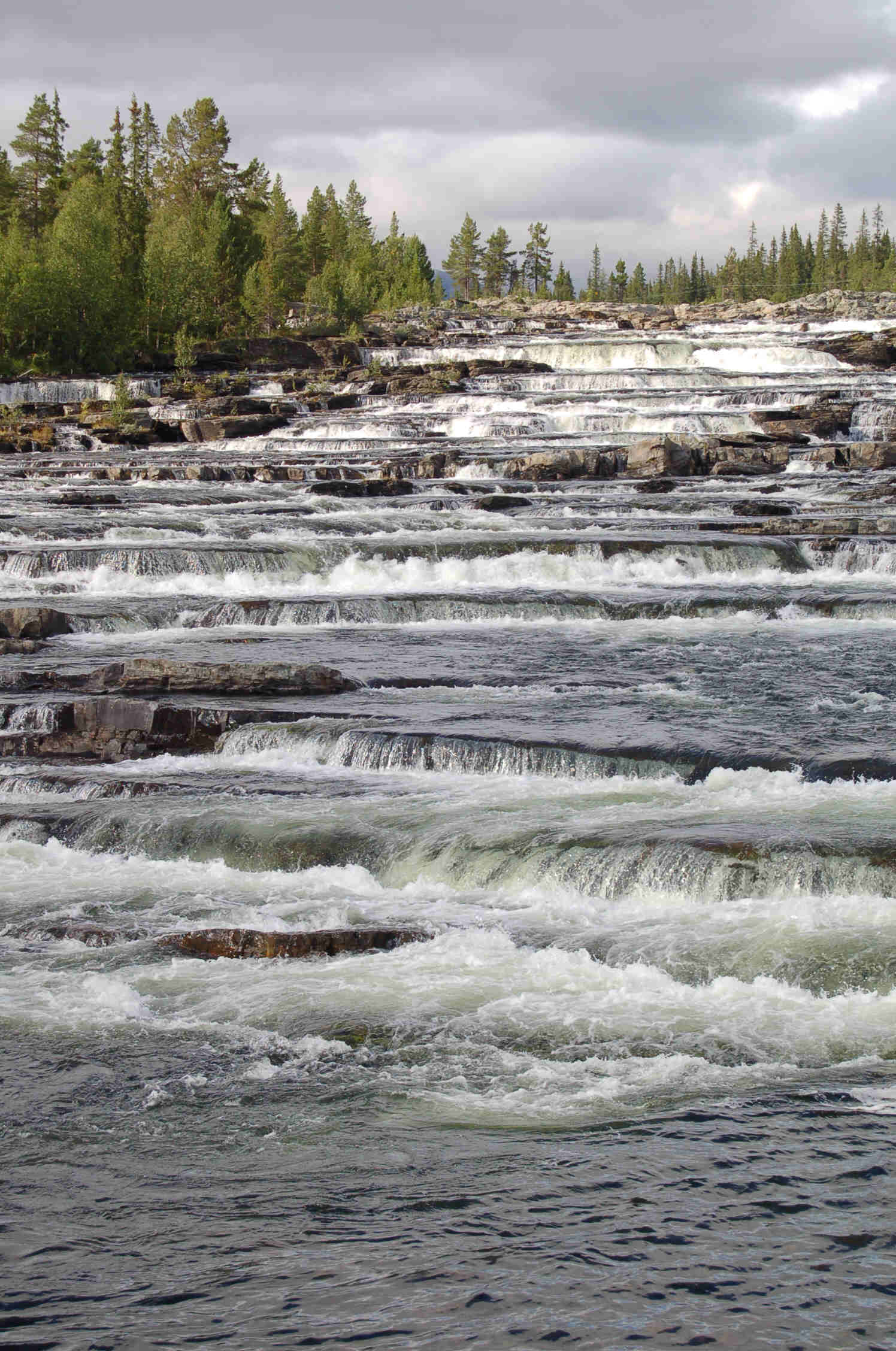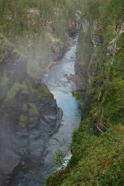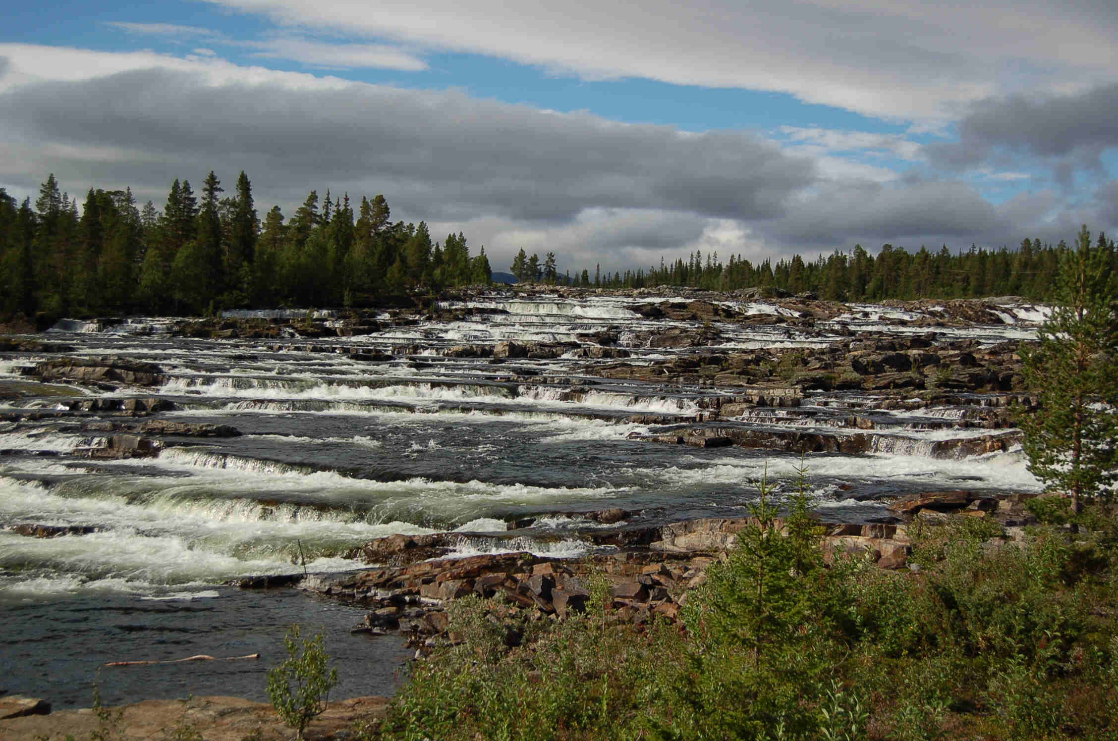 Leider können wir - zu Birgits Enttäuschung - kein Schneefeld erreichen. Dann kommen wir zum Trappstegforsen, erneut einem wunderbaren Wasserfall. Ganz in der Nähe übernachten wir am Litsjöforsen. Beide Wasserfälle werden vom Kultsjöan gebildet.