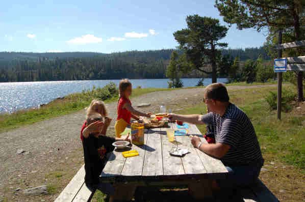 08.08.2007 Heute wollen wir uns Richtung Wildmarksvägen aufmachen. Morgens fahren wir, nach ausgiebigem ruhigem Frühstück und einem "Hausputz" von Östersund aus los, auf der RV 45 Richtung Strömsund. Kurz vor Strömsund stehen wir zum ersten Mal im Urlaub in Schweden im Stau. Nach kurzer Zeit zeigt sich, dass ein Unfall uns aufhält. Offensichtlich ist eine Straßenbaumaschine während des Transports abgestürzt, über die Leitplanke gerutscht und beinahe in den See gestürzt. Mit vereinten Kräften von Feuerwehr, Polizei und vielen Baugeräten gelingt es endlich, die Maschine aufzurichten und wir können weiterfahren. Direkt nach der Unfallstelle biegen wir auf die 342 ab und finden uns auf dem Wildmarksvägen. Für unsere Mittagspause finden wir bei Torsfjärden eine sehr romantische Stelle und genießen das schöne Wetter, während es in Deutschland regnet.