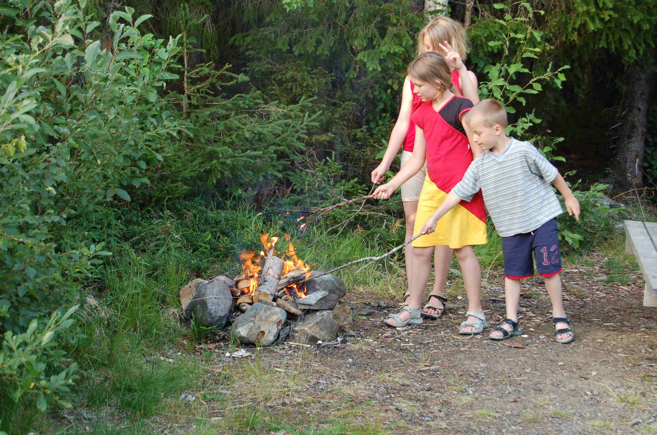 Abends entfachen wir ein Lagerfeuer an der Grillstelle neben dem Womo. Das hat gleich 2 Vorteile, die Kids haben einen Riesenspaß mit dem Feuer und der Rauch hält die Schnaken (Stechmücken) ab, von denen es hier recht viele gibt.