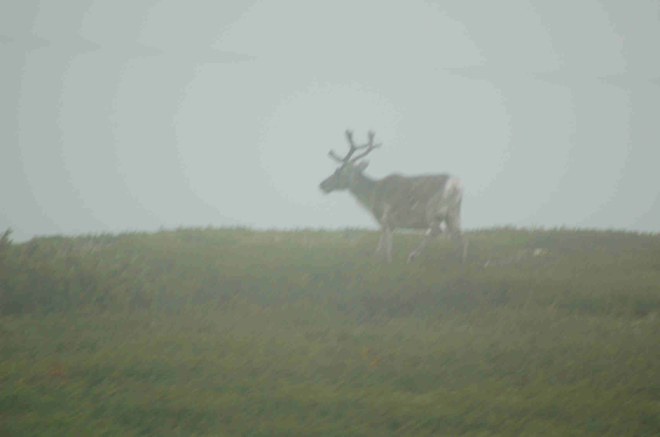 Als wir schließlich den Gipfel erreichen, ist dieser in einer Regenwolke und die Sicht auf unter 50 m reduziert. Da lassen sich selbst die Rentiere wegen des Nebels praktisch nicht scharf fotografieren.
