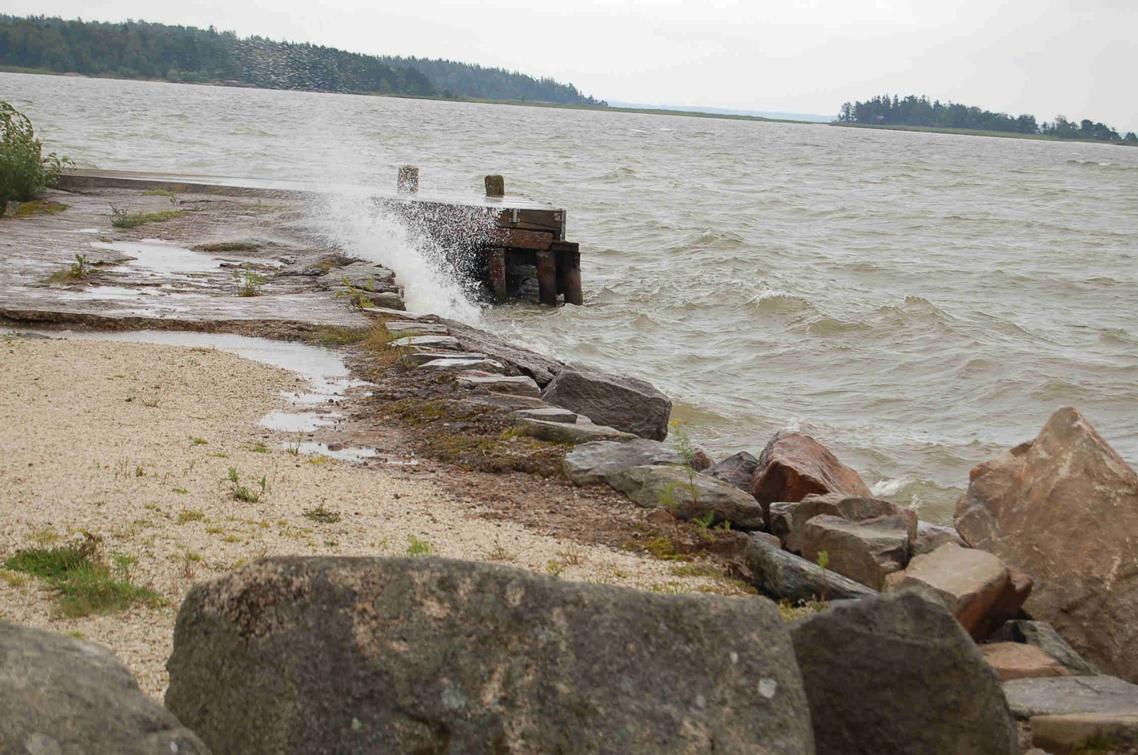 Ca. bei Km 10 gibt es einen 160 m langen unbeleuchteten Tunnel, den die Kids unbedingt befahren wollen. Danach schließt sich eine Gefällstrecke von ca 2 km an, die wir lieber nicht auch noch befahren. Die Draisinen sind ohne Schaltung und auf ebener Strecke fährt man wie mit einem Kinderfahrrad, d.h. man treppelt sich die Seele aus dem Leib. Bei Steigungstrecken ist die Übersetzung für die relativ schweren Draisinen (eine wiegt leer ca. 50 kg) dann eher zu groß, d.h. es ist sehr anstrengend die mit jeweils 3 Personen besetzten Fahrzeuge anzutreiben. So wenden wir und fahren zurück. Ca. 1 km vor dem Tunnel ist ein kleiner Bahnhof, hier picknicken wir und machen Mittagsrast. Danach machen wir uns auf den Rückweg, für den wir etwa 1 Stunde brauchen. Zurück am Womo ziehen sich die Mädchen um und stürzen sich in den eiskalten See. Wir Erwachsenen genießen die Sonne, sitzen draußen und trinken Kaffee. 15.08.07 In der Nacht beginnt es mal wieder zu regnen und zum Frühstück sitzen wir in weltuntergangsartigen Regengüssen. Da trifft es sich gut, dass wir sowieso heute weiterfahren wollten an den Vännern, einen der beiden großen Seen Schwedens. Unterwegs füllen wir noch unseren Wasservorrat nach und kaufen in Mellerud ein. Da wir in einer Stadt sind, möchte ich versuchen über ein offenes WLan meine E-Mails zu checken. Wir sind gerade einmal 50 m in ein Wohngebiet gefahren, als wir bereits das erste offene Wlannetz gefunden haben. Ich lösche ca. 80 Spam-emails und schreibe eine Antwort. Gegen 12.30 erreichen wir die erste Empfehlung unseres Womo-Reiseführers. Allerdings erweisen sich auch hier die Informationen als veraltet. Aus dem Stellplatz sind private Flächen geworden, Rutsche und Trockenklo sind verschwunden bzw. nicht benutzbar. So fahren wir auf der RV 45 weiter und folgen ca. 30 km später einem Badplats-Schild erneut zum Vännern. Der Badplats (Skihall) erweist sich allerdings eher als Bootsplats, es gibt keine komfortable Möglichkeit ins Wasser zu gelangen (Wie ich später noch unfreiwillig feststellen werde). Dafür gibt es Bootsstege und haufenweise Boote. Zunächst wollen wir aber auch nicht baden, wir bewundern wie der Wind den See aufpeitscht und die Gischt auf den Steg schäumt und spritzt.
