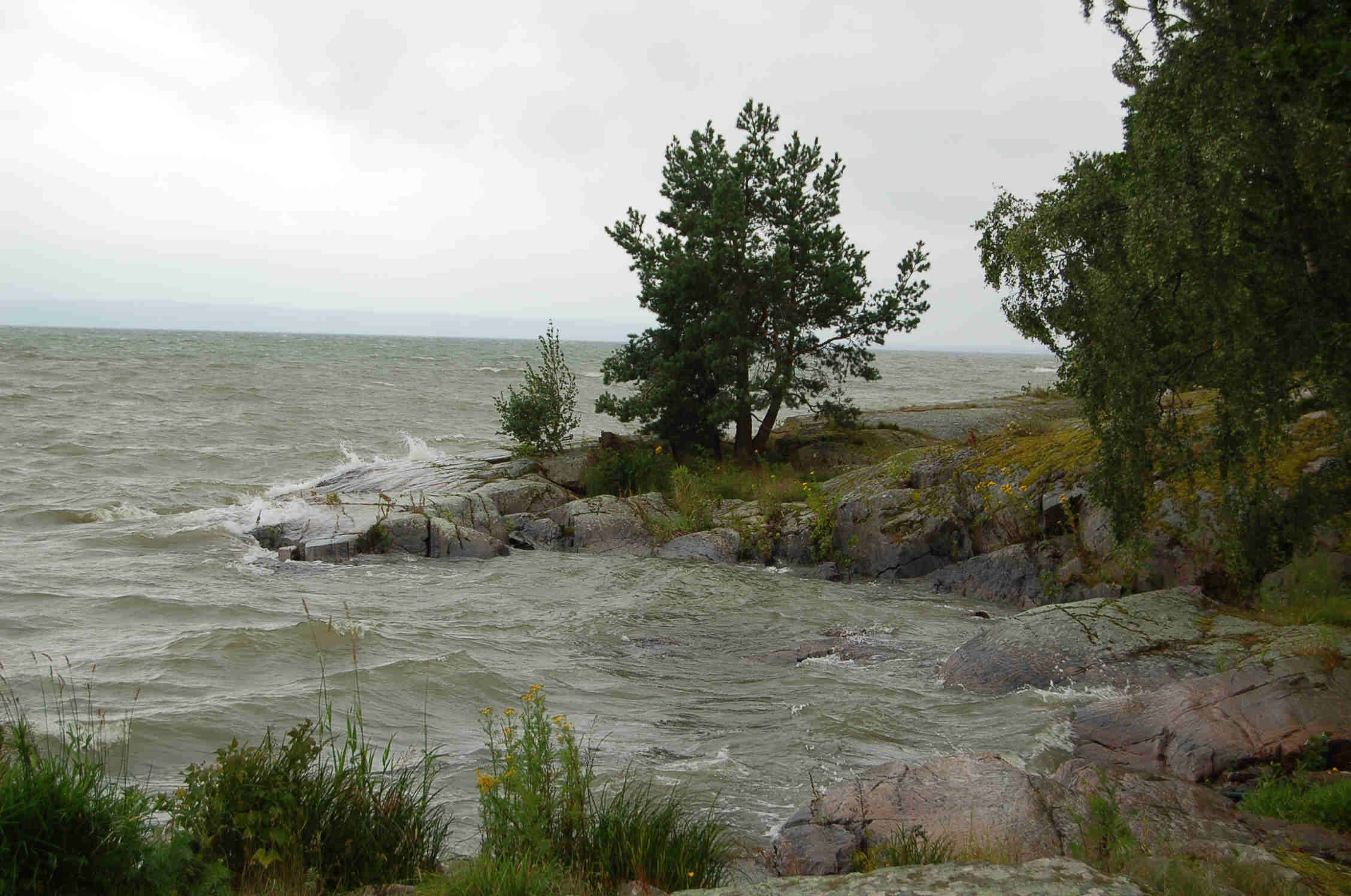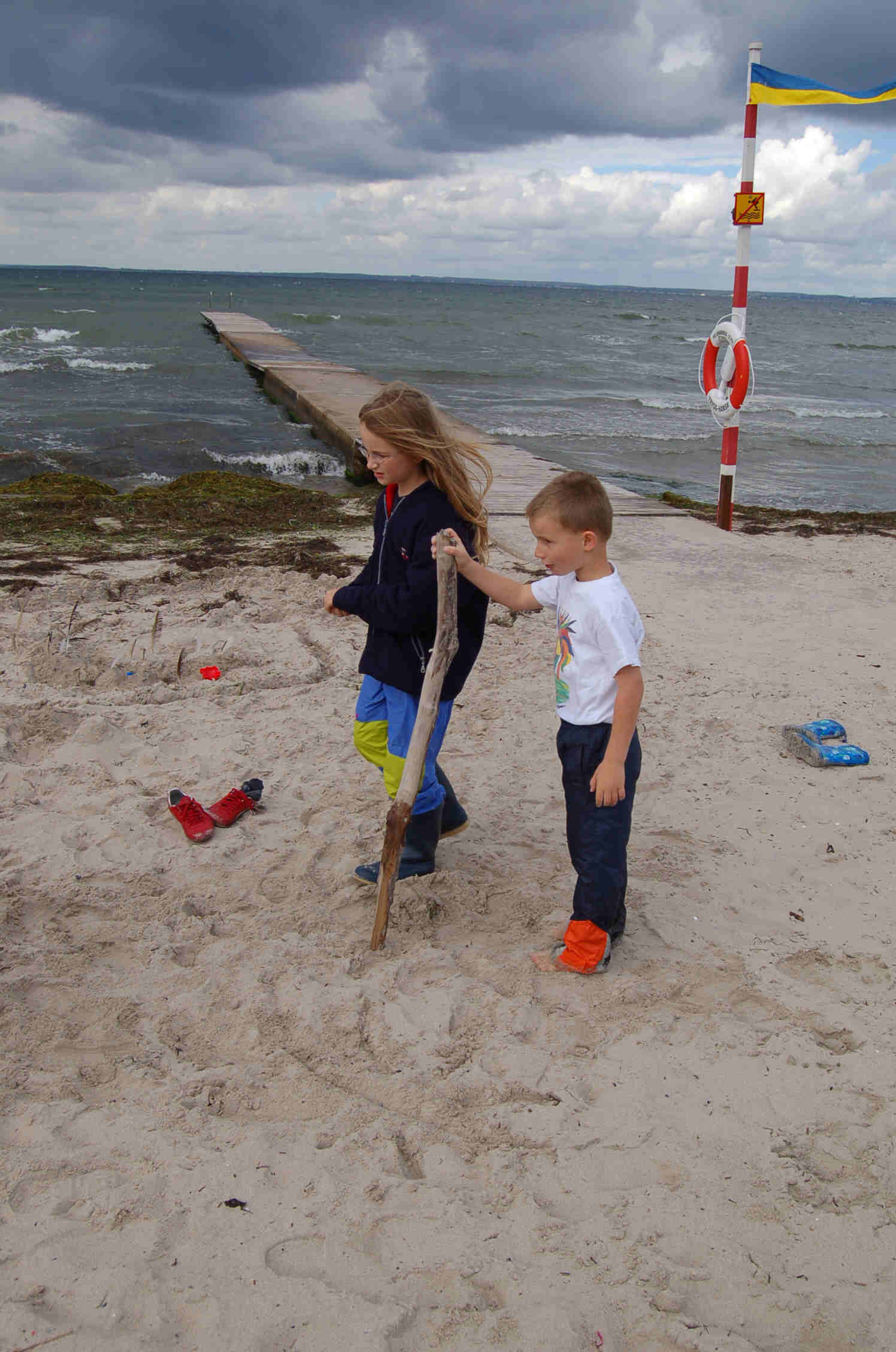 Danach geht es weiter Richtung Fähre, bei Ryfebäck in der Nähe von Helsingborg steuern wir von der E 4 Richtung Meer und finden einen schönen sturmgepeitschten Stellplatz direkt am Meer. Die Kids stürzen ans Meer, sie sind noch nicht ganz dort, als ein Gewitterregen einsetzt und sie völlig durchnässt. So langsam werden die trockenen und sauberen Kleidungsstücke knapp. In der Dusche türmt sich ein Berg nasser Wäsche.