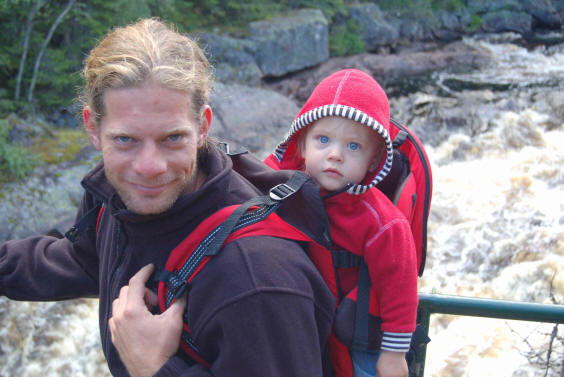 Wir fahren nach dem Frühstück weiter, heute wollen wir wandern! Am Parkplatz erwarten uns schon die Mücken und es sieht so aus, als wolle es gleich regnen. Also Regenjacken mitnehmen. Laut Reiseführer soll die Wanderung ca. 4 Stunden dauern, wir packen daher 5 Liter Wasser ins Gepäck und dann bricht das Dutzend auf. (Edda im Rucksack auf Christians Rücken)