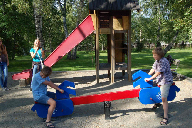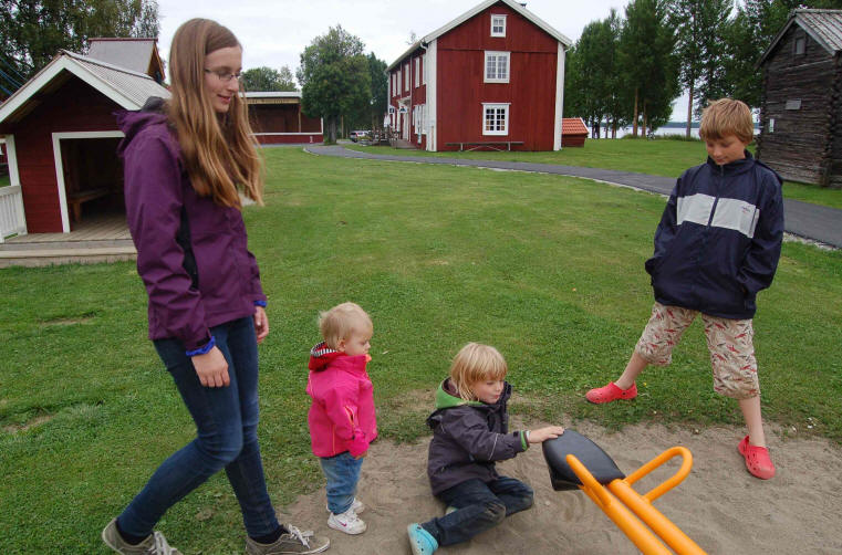 Um 8.00 Uhr werden wir wach. Nach dem Frühstück fahren wir ins Industriegebiet in Östersund und kaufen ein. Danach gehts weiter nach Strömsund, wir besuchen nochmals das Freilichtmuseum beim Riesen Jörn. Die Kinder haben viel Spaß auf dem Spielplatz, außer Astrid, ihr ist schlecht und sie bleibt im Womo. Theo geht es wieder besser, er hat kein Fieber mehr. Da wir kein Klohaus zum Entsorgen gefunden haben, fahren wir den örtlichen Campingplatz zum Entsorgen an. Für unverschämte 5 Euro je Womo (40 Kr) dürfen wir die Klotanks entleeren.