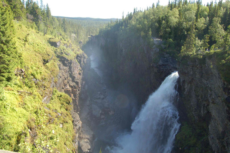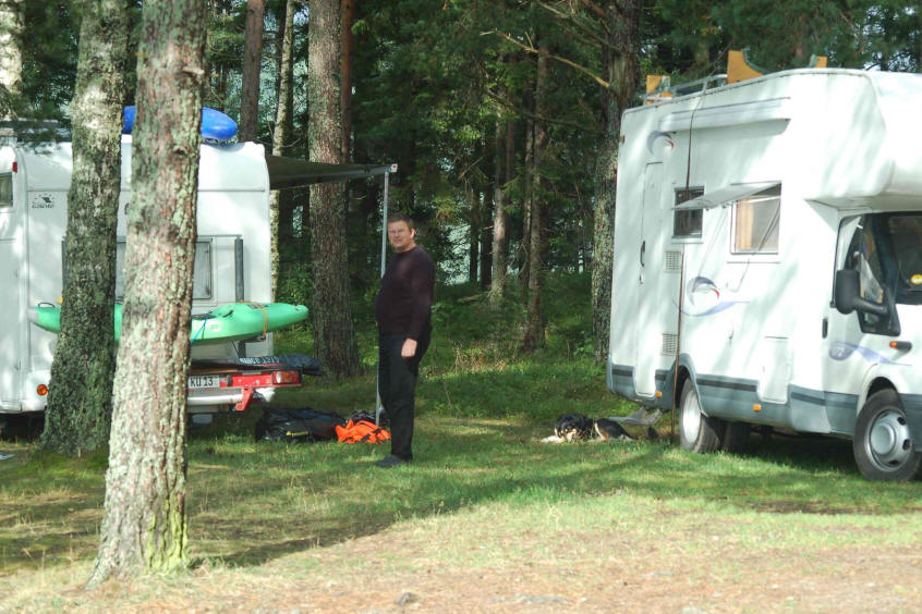 Morgens ist es neblig, aber das Wetter verspricht schön zu werden. Nach dem Frühstück fahren wir zum Hällingafallet, wir laufen zum Fall, Klaus und ich gehen zum unteren Parkplatz und sehen nach ob die Stelle zum Einsetzen des Bootes geeignet wäre. Klaus möchte es probieren und so fahren wir gemeinsam mit seinem Womo zum unteren Parkplatz, Klaus startet mit seinem Boot, wir (Christian, Kirstin, Edda, Theo und ich) fahren das Womo bis zur Brücke. Bis hier will Klaus fahren und will dass wir ihn hier wieder aufsammeln. So geschieht es dann auch, nur Klaus ist enttäuscht, der Fluss führt zu wenig Wasser und so ist die Abfahrt für ihn enttäuschend. Am Abend grillen wir alle gemeinsam an der Feuerstelle, später nutzen wir das Grillfeuer als Lagerfeuer. Bis auf unsere 3 Wohnmobile sind wir ganz alleine, traumhaft. Nur Heike fühlt sich nicht gut und geht früh zu Bett.