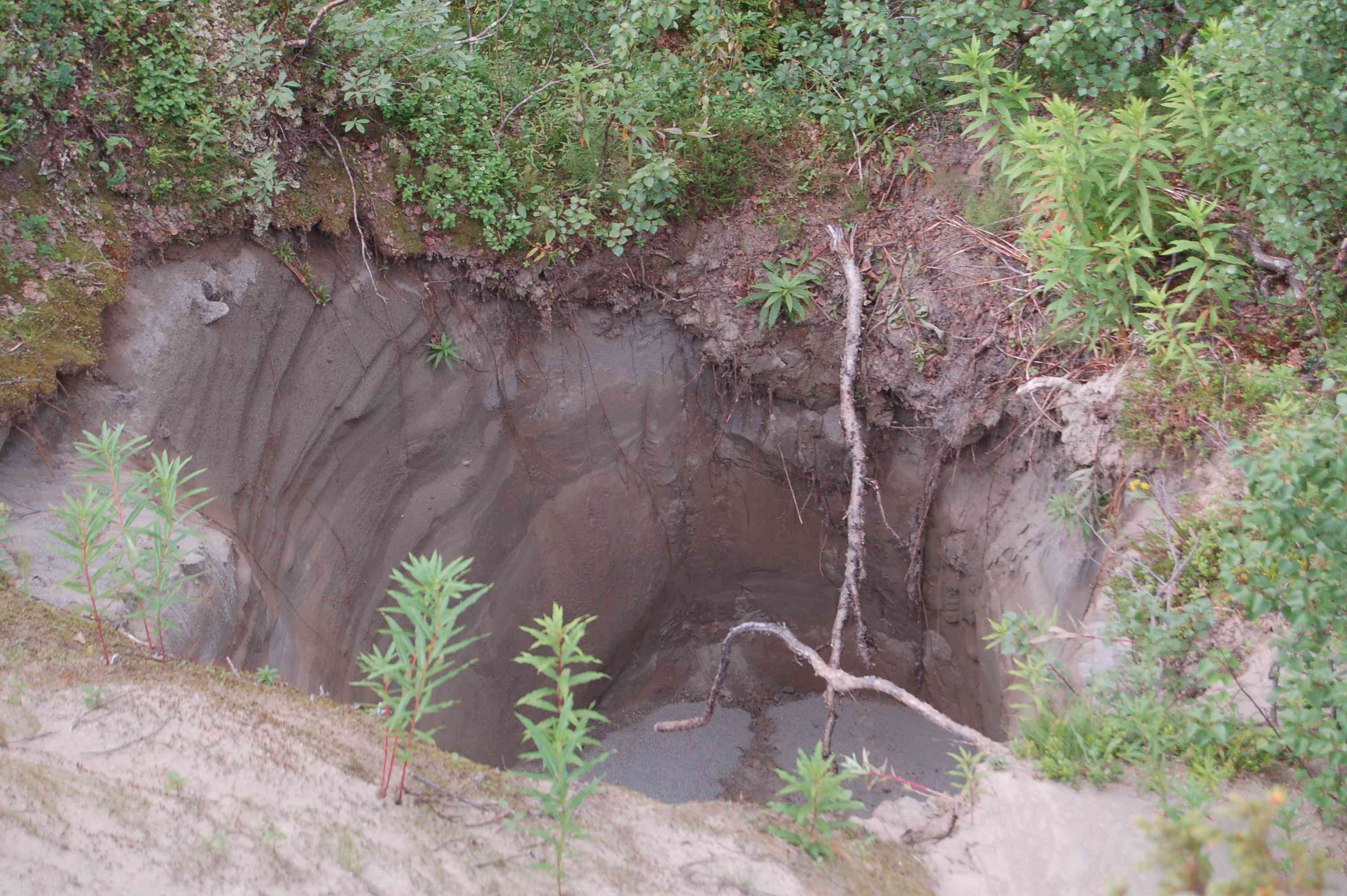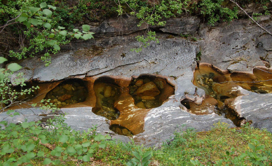 Nach 3km ist der erste Zwischenstopp, eine Schutzhütte erreicht. Von hier aus geht es für weitere 6km über Stock und Stein am Wasser entlang. Die Mücken sind eine rechte Plage, jeder freie Quadratzentimeter Haut wird von ihnen bedacht. Auf dem Weg sind auch einige Gletschermühlen zu bestaunen.