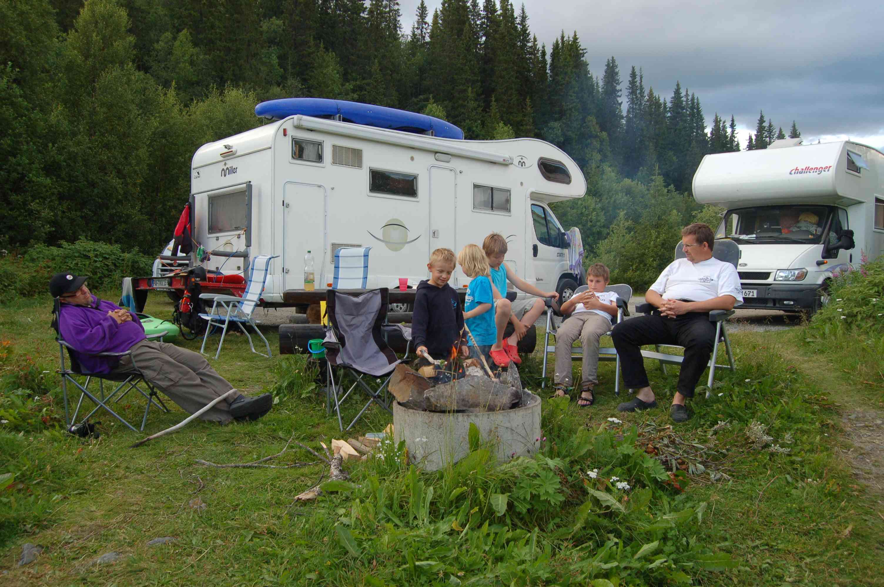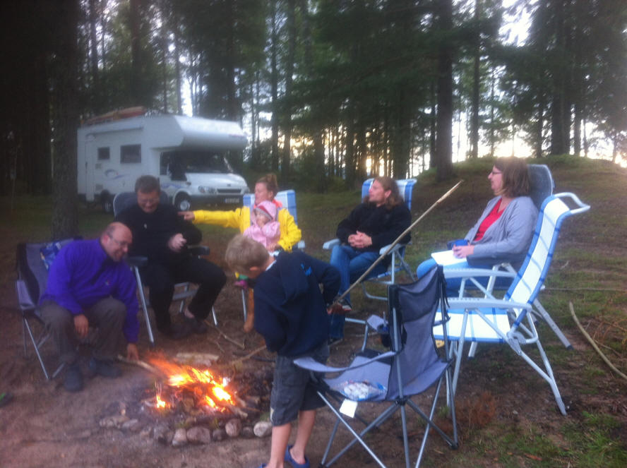Mit unseren 3 Wohnmobilen ist der Platz gut ausgefüllt. Klaus lädt sein Boot ab und fährt auf dem Fluss. Die Jungs und ich gehen baden, am späten Nachmittag spielen wir nochmals Völkerball. Beim Abendessen reicht es den Kindern, sie flüchten schimpfend und fast schon verzweifelt vor den Stechmücken ins Womo. Nur mit Mühe gelingt es uns sie noch einmal zu motivieren dieses zu verlassen und nur für ihr Lieblingsspiel "Stille Post mit Bildern". Selbst das qualmende Lagerfeuer und "Autan" oder das schwedische "mückla" können die Mücken nicht abhalten. Danach gehen wir alle ins Bett.