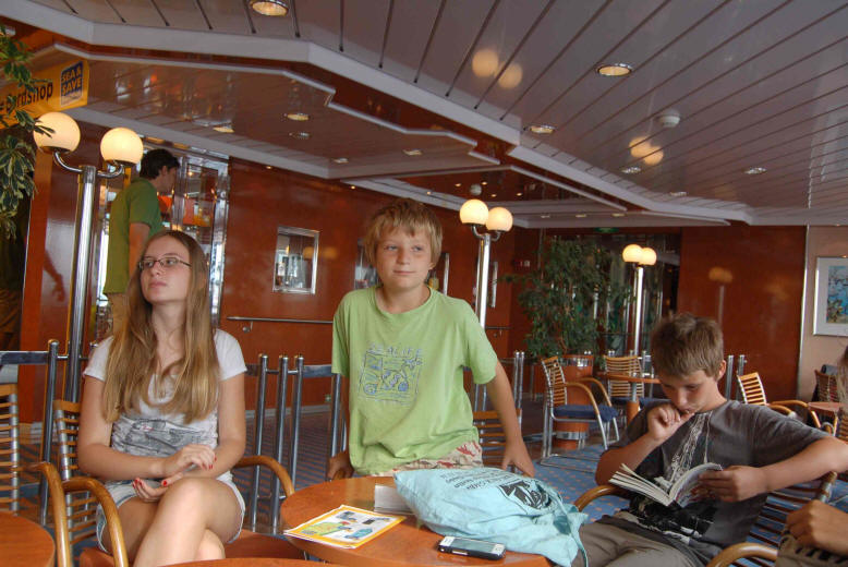 Wir checken auf der Fähre ein. An Bord nutzen wir den kostenlosen Strom und das W-Lan, ich überarbeite den Reisebericht und "klebe" die Fotos zu den Texten ein.