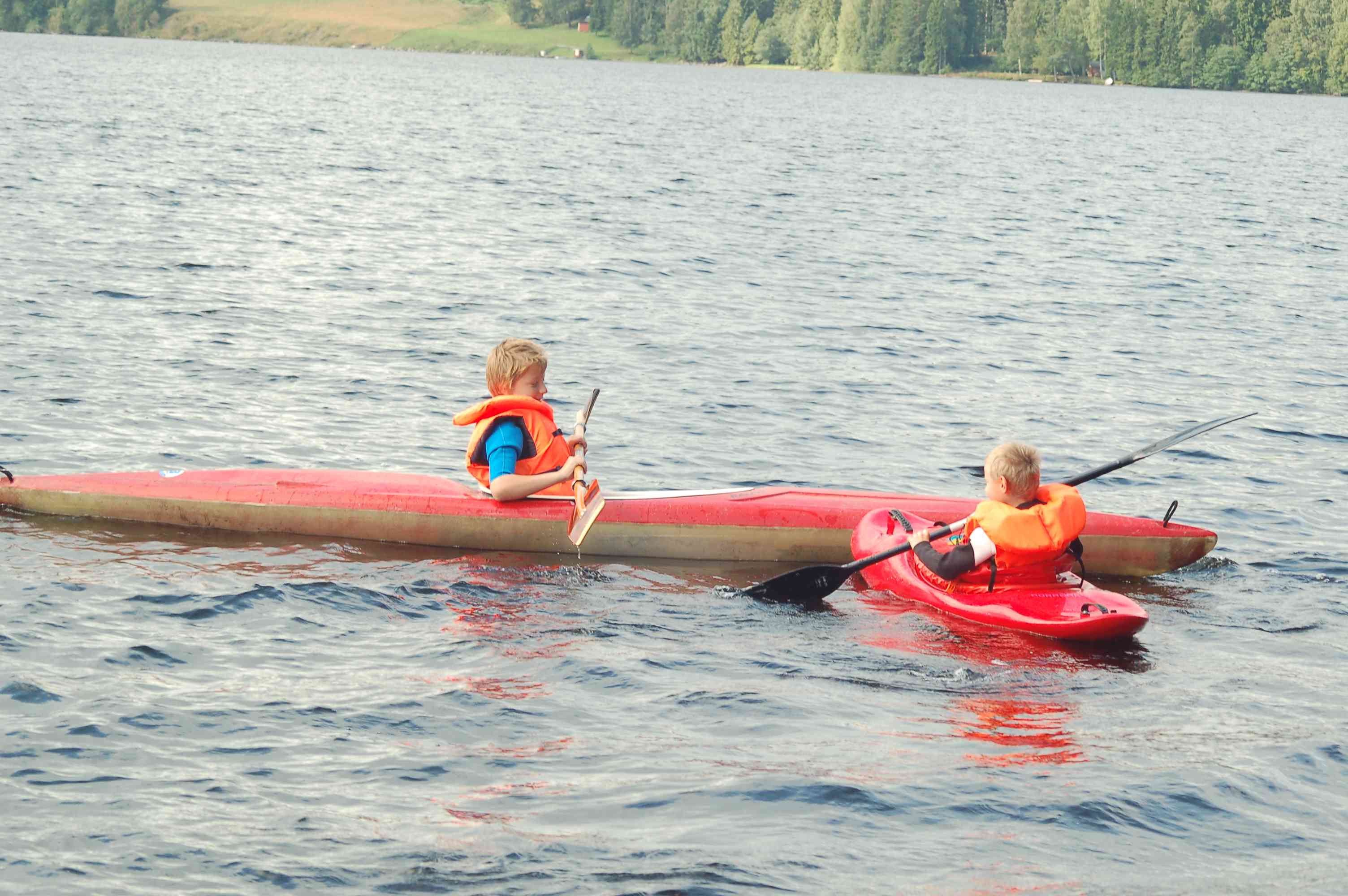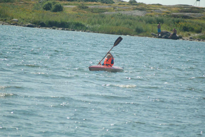 Danach fahren wir weiter auf unseren Lieblingsplatz am Torsfjärden und laden die Boote ab. Christian und Marc paddeln los, Marc in unserem, Christian in Klaus Boot. Auch Fabian paddelt, beide Jungs baden. Danach gibt es Abendessen, bei Christians Familie gibt es ein gegrilltes Brathähnchen, das an einer Stelle etwas stark geröstet ist. Theo möchte das nicht und sagt: Ich will kein rostiges Brathähnchen". Später zünden wir ein Lagerfeuer an und die Kinder haben viel Spaß mit gegrillten Würstchen und Marshmallows.