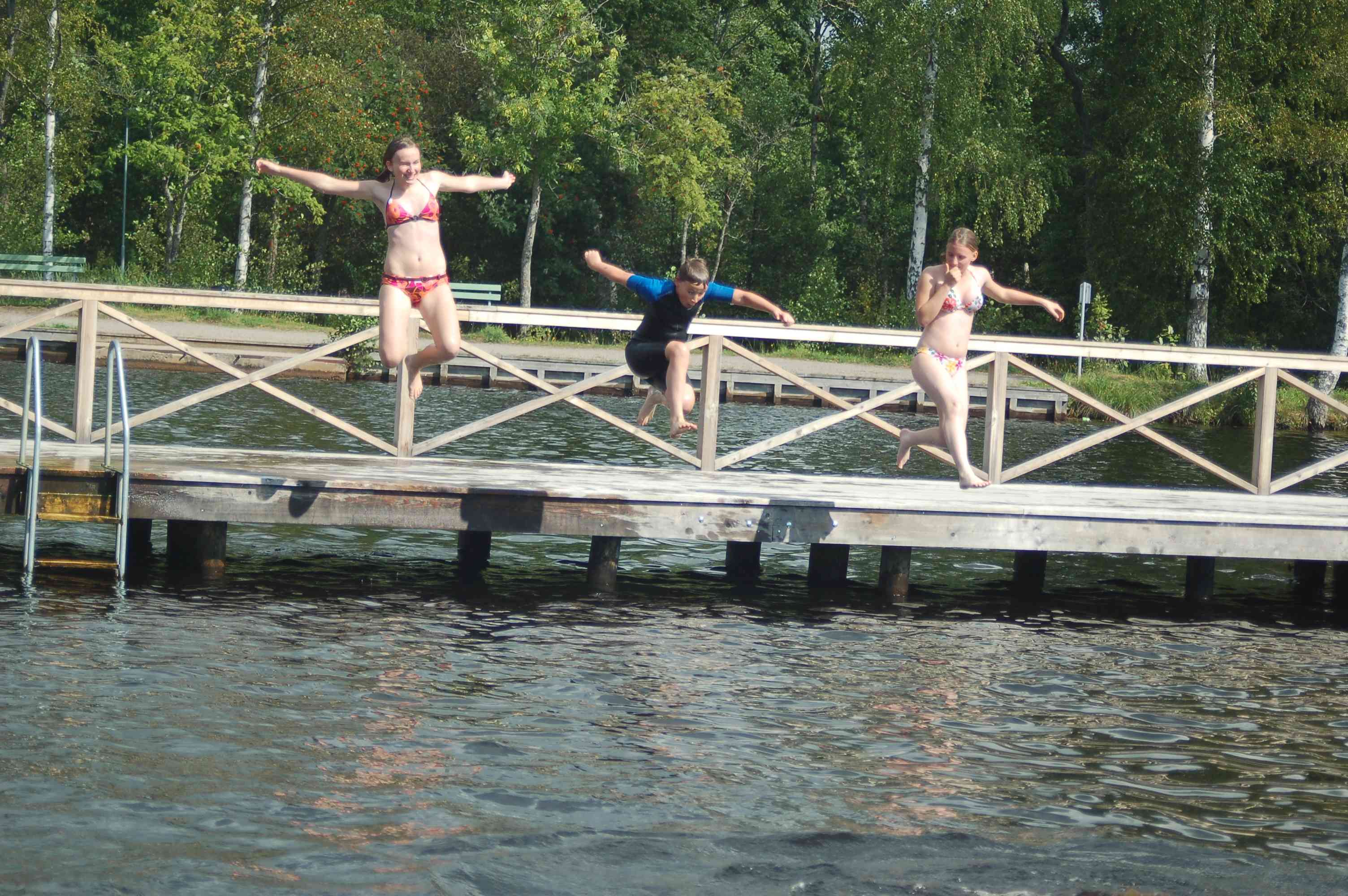 Christian beginnt eine Heuschlacht und danach sehen alle entsprechend aus. Danach fahren wir zu einem nahegelegnen Stellplatz im Wald und alle stürzen sich ins relativ warme Wasser des Sees. Am Abend machen wir ein Abschiedslagerfeuer, Christian und seine Familie brechen um 21.00 Uhr auf zur Fähre.