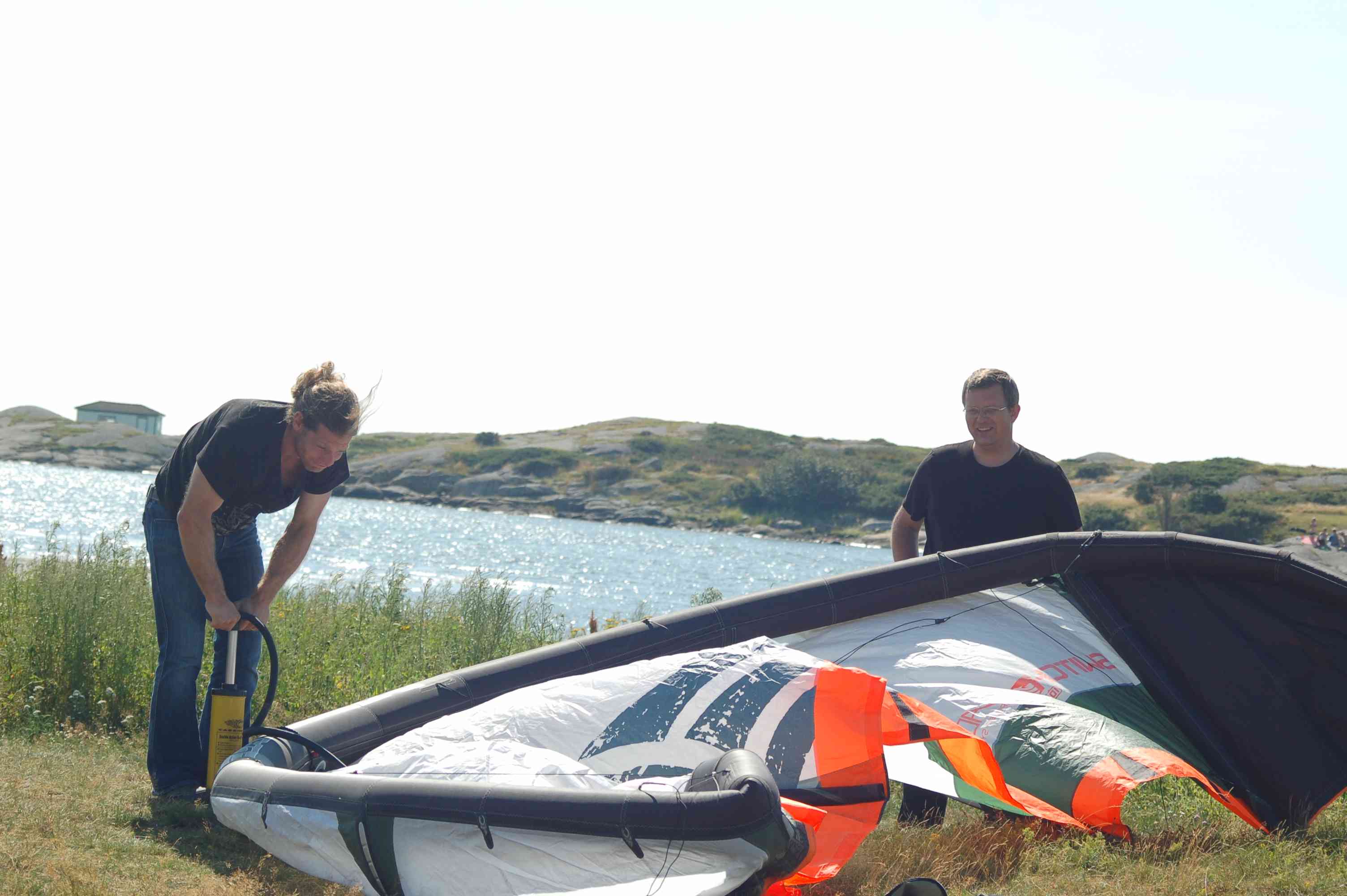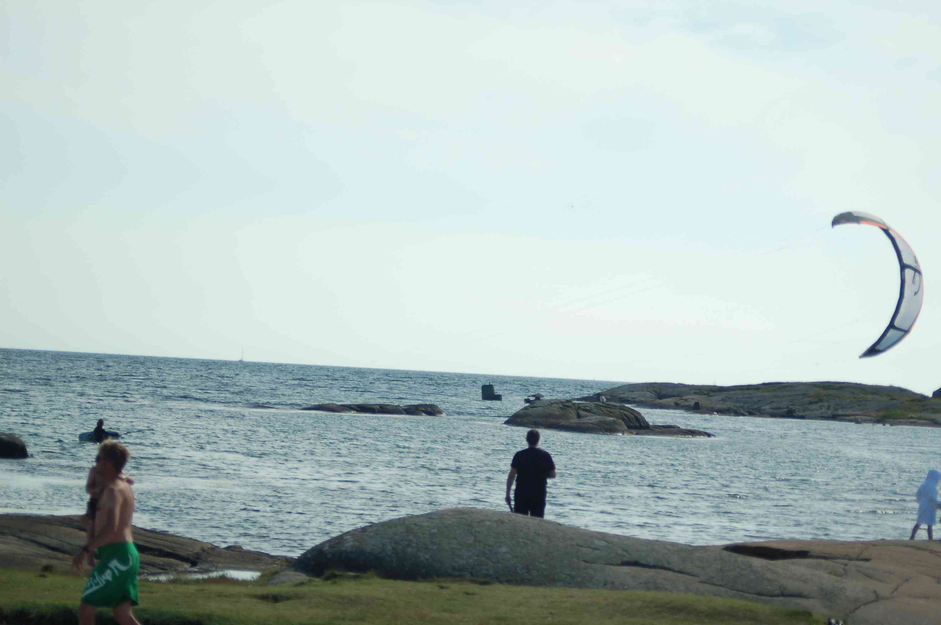Wir fahren nach dem späten Frühstück ca. 150km nach Varberg, dort soll ein Kite-Point sein, an dem Christian nach Möglichkeit kiten möchte. Der Parkplatz an Strand bietet ein Luxusklohaus mit Toiletten und Außenwasseranschluss. Die Kinder gehen baden, Marc und Fabian versuchen zu paddeln, leider ist die Bucht so flach, dass das Boot ständig auf Sandbänken aufsetzt.