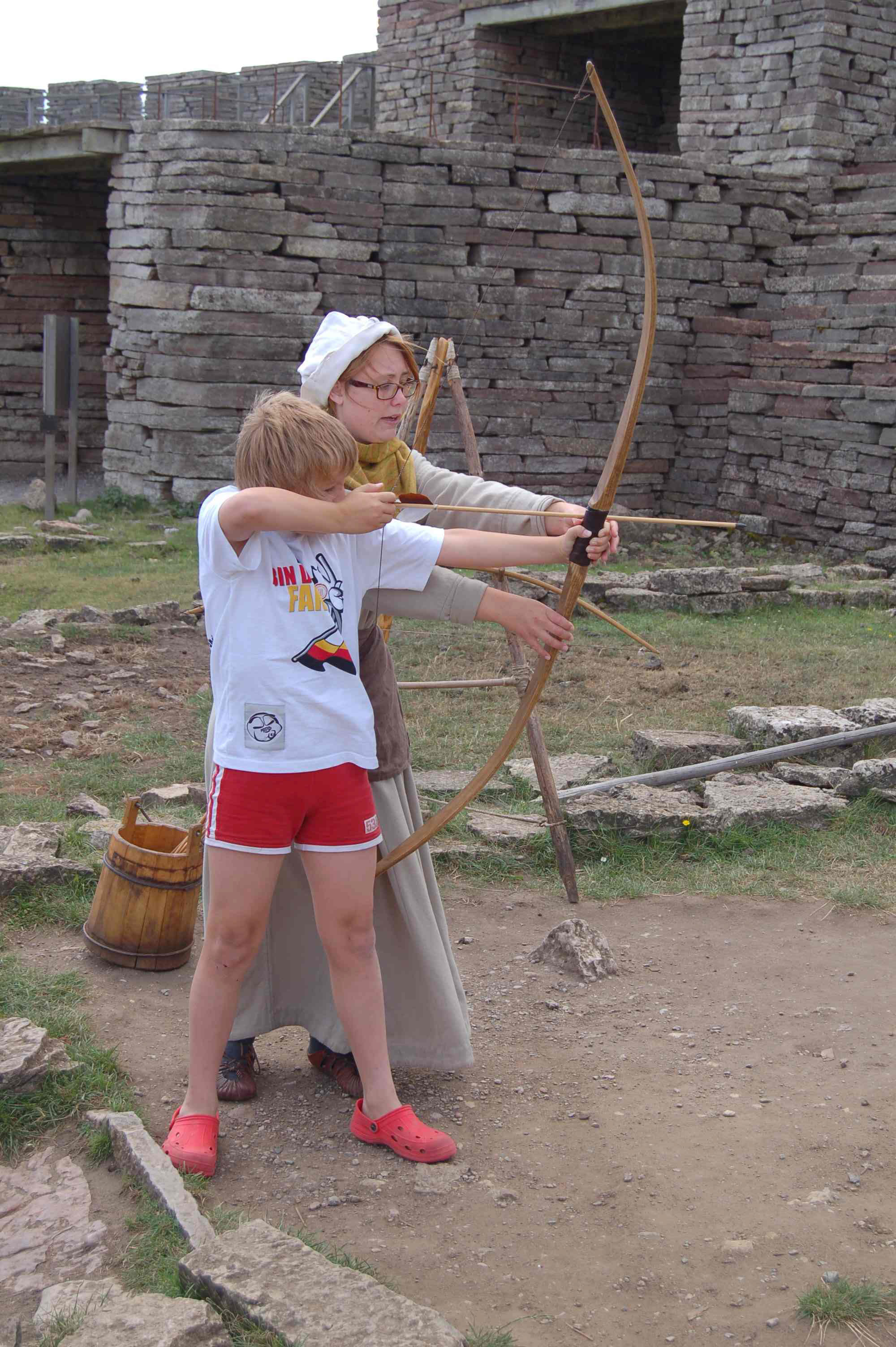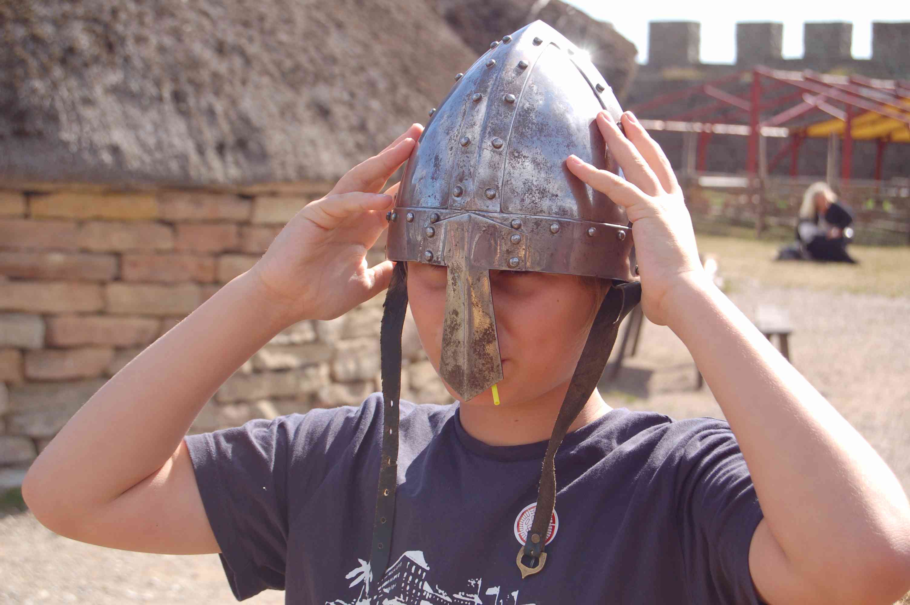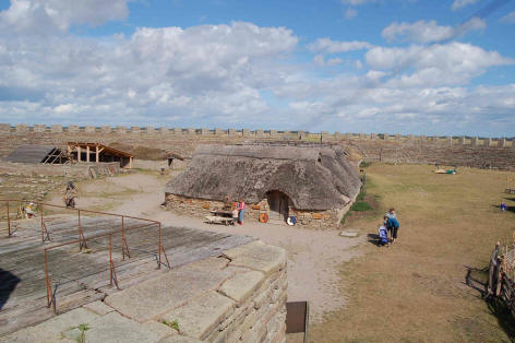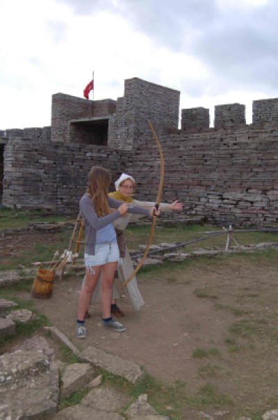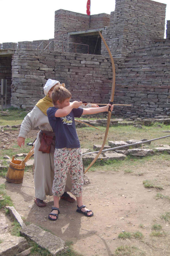 Den Eintritt finden wir mit 10 Euro je Erwachsenen und 5 Euro je Kind recht hoch, aber Heike möchte trotzdem hinein. Ein frohe Überraschung ist es daher, als die Kassiererin uns mitteilt, heute sei der Eintritt frei, da ein Film für Schüler gedreht würde. Wir besichtigen die wiederaufgebaute Festung. In dieser gibt es verschiedene Spielangebote für Kinder, Bogenschießen, Tauziehen, Wikingerschach,