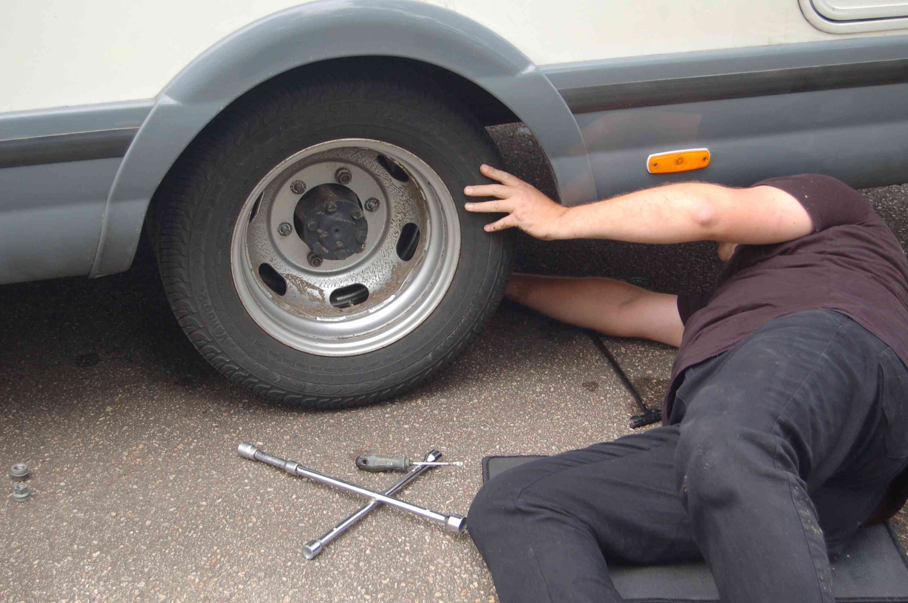 Um 6.50 Uhr, noch vor dem Wecker werden wir wach, frühstücken und rufen um 7.30 Uhr bei Ford an, ob die Ersatzteile da sind. Es wird spannend..."Moment, ich frage mal nach.. ja, sie sind mitgekommen". Gott sei Dank, wir starten um 8.00 Uhr mit Christians Wohnmobil nach Sunne, nach ca. 70 Minuten kommen wir an und tatsächlich, der Vergleich der alten Teile mit den neuen ergibt, dass die Teile passen. Wir bezahlen über 5.600 Kronen ca. 700 Euro, fast der doppelte Preis der Teile in Deutschland, aber was sollen wir machen? Wir sind froh, dass wir die Teile haben und unser Womo wieder flott bekommen. Wir erkundigen uns noch wo der nächste Baumarkt ist, da wir eigentlich einen stark gekröpften 8er Ringschlüssel für die Entlüftungsschrauben der hinteren Radbremszylinder benötigen und einen durchsichtigen Plastikschlauch zum Entlüften der Bremse. Einen stark gekröpften 8er bekommen wir nicht, aber wenigstens einen normal gekröpften und Plastikschlauch. Um 11.00 Uhr sind wir zurück am Womo und sofort beginnt die Reparatur. Christian holt aus dem Altpapiercontainer eine große Pappe auf der wir uns unter das Auto legen können, ich aus dem Sammelcontainer für Blechdosen eine leere Blechdose zum Entlüften der Bremse. Dann geht's los. Gemeinsam mit Christian montieren wir die neuen Bremsbacken, wir bauen nicht die Hinterachse auseinander, wie Ford dies vorgibt, sondern manövrieren die Bremsbacken an der Radnabe vorbei. Dazu müssen wir die Federn aushängen, das Einhängen der Federn wird schwierig, aber gemeinsam schaffen wir es, auch die Haltefedern der Bremsschuhe einzuhängen. Probleme bereitet das Handbremsseil, ich krieche unter den Wagen und löse die Handbremsseile an der Handbremswippe, dann geht es. So, die Bremsanlage ist zusammen, nun muss noch die Trommel drüber, aber die passt nicht drauf!! Wir kämpfen wie die Weltmeister, aber es klappt nicht, der Grund ist unklar. Also beschließen wir die Rückstellung ganz zusammen zu drehen, dann bekommen wir die Trommel drauf. Anschließend entlüften wir gemeinsam alle 4 Bremsen. Dann folgt eine Probefahrt, aber oh weh! Die Bremse ist "weich" und Bremsleistung liegt bei geschätzt 20% des normalen. Da ist guter Rat teuer, wo liegt der Fehler? Ein Test der Bremstrommeln ergibt, dass die Fahrerseite kalt, die Beifahrerseite warm ist. Also liegt der Fehler wohl dort. Wir bauen die Räder und die Bremstrommel wieder ab, dann stellen wir den Nachsteller wieder auf "weit" Schrittweise näheren wir uns der maximalen Einstellung, bei der die Trommel gerade noch drauf geht, Nun geht es seltsamerweise auch mit aufgedrehter Nachstellung. (Grund ist offenbar der Bremszylinder, der nun "eingearbeitet" ist. Danach entlüften wir die Bremse noch einmal rundum, am hinteren, neuen Bremszylinder kommt zunächst nur wieder Luft. Dann folgt Probefahrt Nummer 2. Ok, nun scheint alles in Ordnung. Wir räumen alles auf und ein, die gebrauchte Bremsflüssigkeit vom Entlüften füllen wir in eine alte Milchtüte. Inzwischen ist es 16.00 Uhr. Notdürftig wasche ich mich, dann starten wir mit den 3 Wohnmobilen und fahren wir in Richtung Orsa, tanken und ver- und entsorgen alle 3 Wohnmobile, dann übernachten wir am Helvetsfallet.