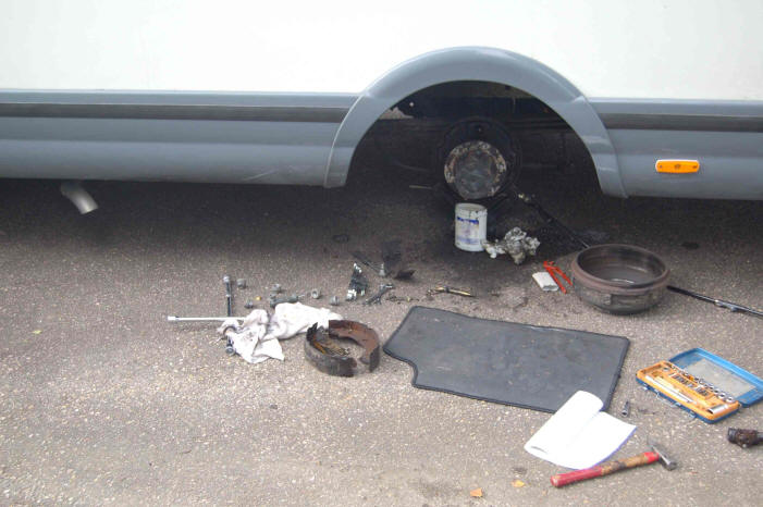 Oh je. Wir bocken den Wagen auf, entfernen Rad und Bremstrommel und sehen die Bescherung. Der Bremszylinder ist völlig zerstört, ebenso die Bremsbacken verbogen, auf einer Seite ist der Belag abgesprungen, auf der anderen Seite völlig herunter geschliffen. Bremsflüssigkeit läuft aus. Heike ruft Klaus an, damit er zu uns kommt, wir haben ja Lars an Bord und an eine Weiterfahrt ist nicht zu denken.