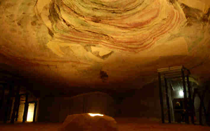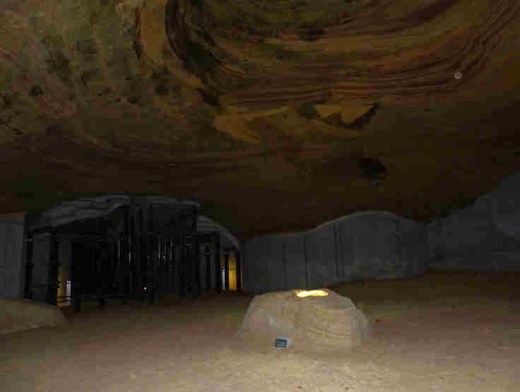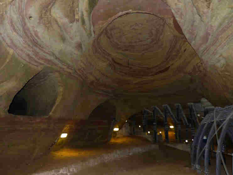 -Es wurden Geister-Buchvorlesungen gemacht mit bis zu 400 Zuhörern, erhellt wurde das ganze von Fackeln. Dies brachte soviel Wärme in die Gänge, dass die Decken austrockneten und sich große Sandschichten ablösten. Zum Glück wurde niemand verletzt, aber die Höhlen gesperrt.- Was aussieht wie fester Sandstein ist nur durch Druck und Feuchtigkeit zusammengehaltener Sand. Mit dem Fingernagel könnte man die Wände bearbeiten. Bei dieser Vorstellung wird uns dann etwas mulmig.