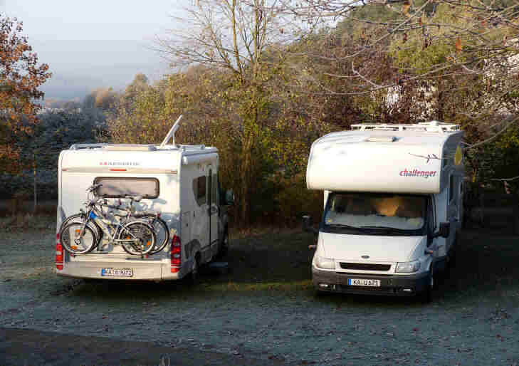 Wir hätten es mit unserem Platz schlechter treffen können, für die Lebensmittelversorgung sorgt der Tante Emma Laden, es gibt einen Altpapier- und einen Blechdosencontainer, die uns später noch nützlich werden, außerdem ist unser Parkplatz einigermaßen eben. Es fehlt zu unserem Glück nur ein Frischwasseranschluss oder noch besser ein Klohaus.