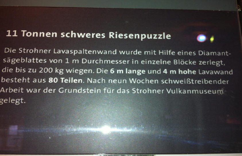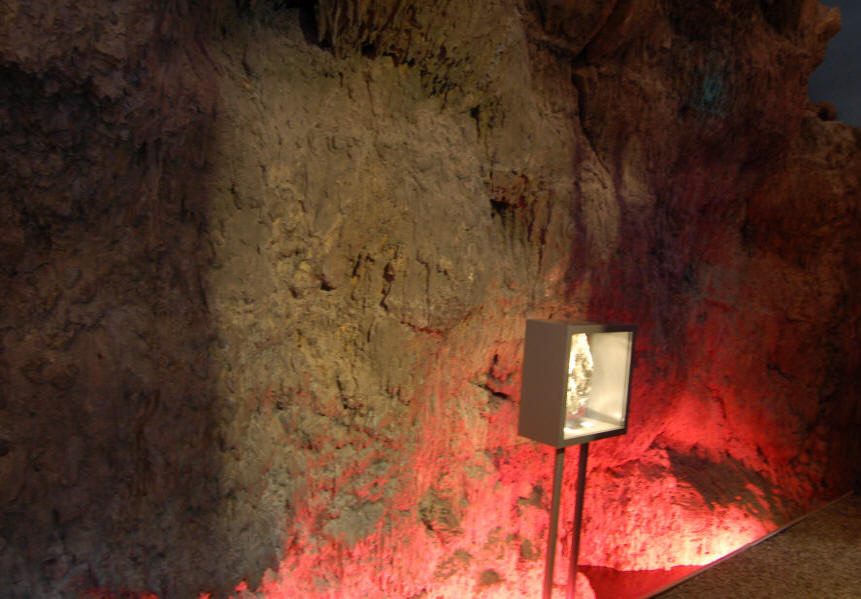 Attraktion des Museums ist ein Stück echte Vulkanhöhlenwand, das einige Meter entfernt in einem Steinbruch gefunden, dort zersägt und hier im Museum wieder aufgebaut wurde.