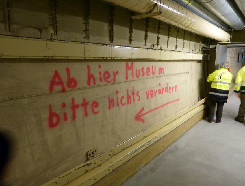 Am fazinierensten am Bunker fanden wir die "typische deutsche" Perfektion der Bunkeranlage. erst wird alle perfekt zum Schutzraum ausgebaut, als die Anlage nicht mehr gebraucht wird, perfekt wieder abgerissen. Es wurde sogar die Farbe von den Wänden entfernt, es blieben nur die wenigen Meter der Anlage erhalten (etwa 2%) die heute als Mueseum zu besichtigen sind.