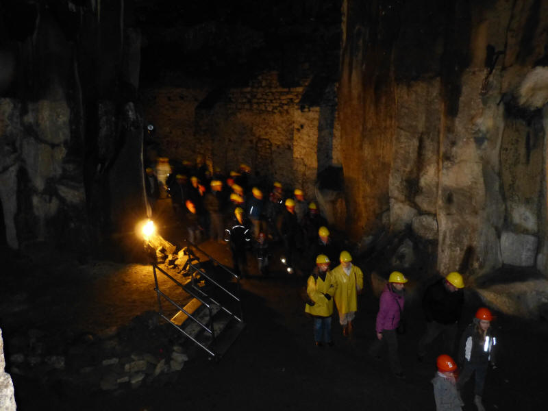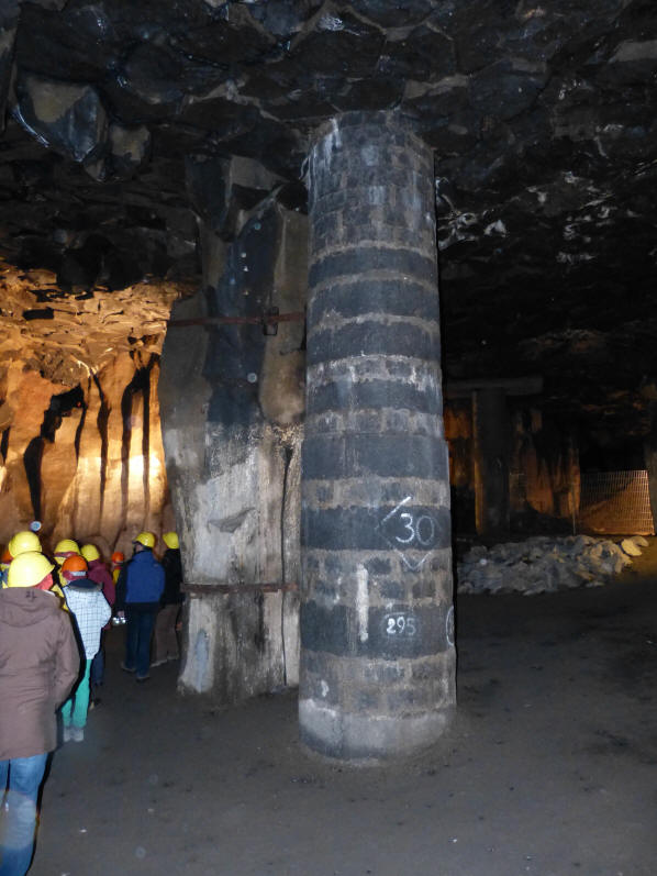 Wir entlassen sie nach einer Stunde ins Womo, wir Erwachsenen wollen noch in den "Keller". In Mendig wurde über Jahrhunderte im Bergbau die bis zu 30 m mächtige Schicht schwarzer Basaltlava abgebaut. So ist ein riesiges Höhlensystem unter der Stadt entstanden (1,4 QKm groß) Dieses Höhlensystem wir meist mit "Keller" bezeichnet. über 150 Stufen geht es 30m hinab in den Unterwelt, wir stehen in einer großen hohen Halle. Dort erfahren wir das in den Jahren 1830- 1900 sich zahlreiche Brauereien in Mendig ansiedelten, die die kühlen Keller zur Lagerung von Bier nutzten. Mit der Erfindung leistungsstarker Kühlgeräte ab 1910 verschwand diese Nutzung und auch die meisten Brauereien. Heute sind die Keller vielfach ungenutzt, z.T. wurden sie über die Belüftungsschächte mit Müll und Unrat gefüllt. Der Führer will uns animieren, doch im Keller zu heiraten oder dafür Werbung zu machen. Aber in diesem dunklen Loch heiraten? Also da können wir uns wirklich schönere Orte für dieses freudige Ereignis vorstellen!