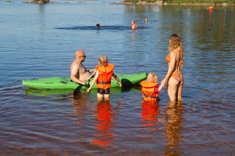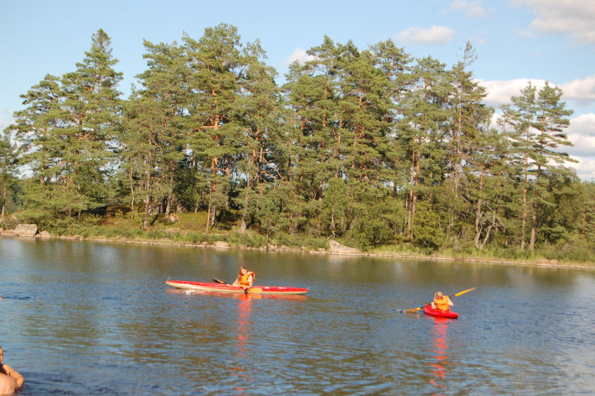 Nach dem Wachwerden fahren wir bis auf Höhe Växjö, unterwegs tanken wir Diesel und Wasser. Klaus erwirbt im Baumarkt einen 1/2 Zoll Adapter zum Wasser tanken an den Tankstellen, wir ein Paar fester Schuhe für Marc. Am späten Nachmittag kommen wir am Stellplatz an. Es ist Traumwetter, strahlender Sonnenschein und 30 Grad C. Alle wollen Baden im See, der auf einmal gar nicht so kühl scheint. Danach paddeln Birgit und die Jungs mit unseren Paddelbooten.