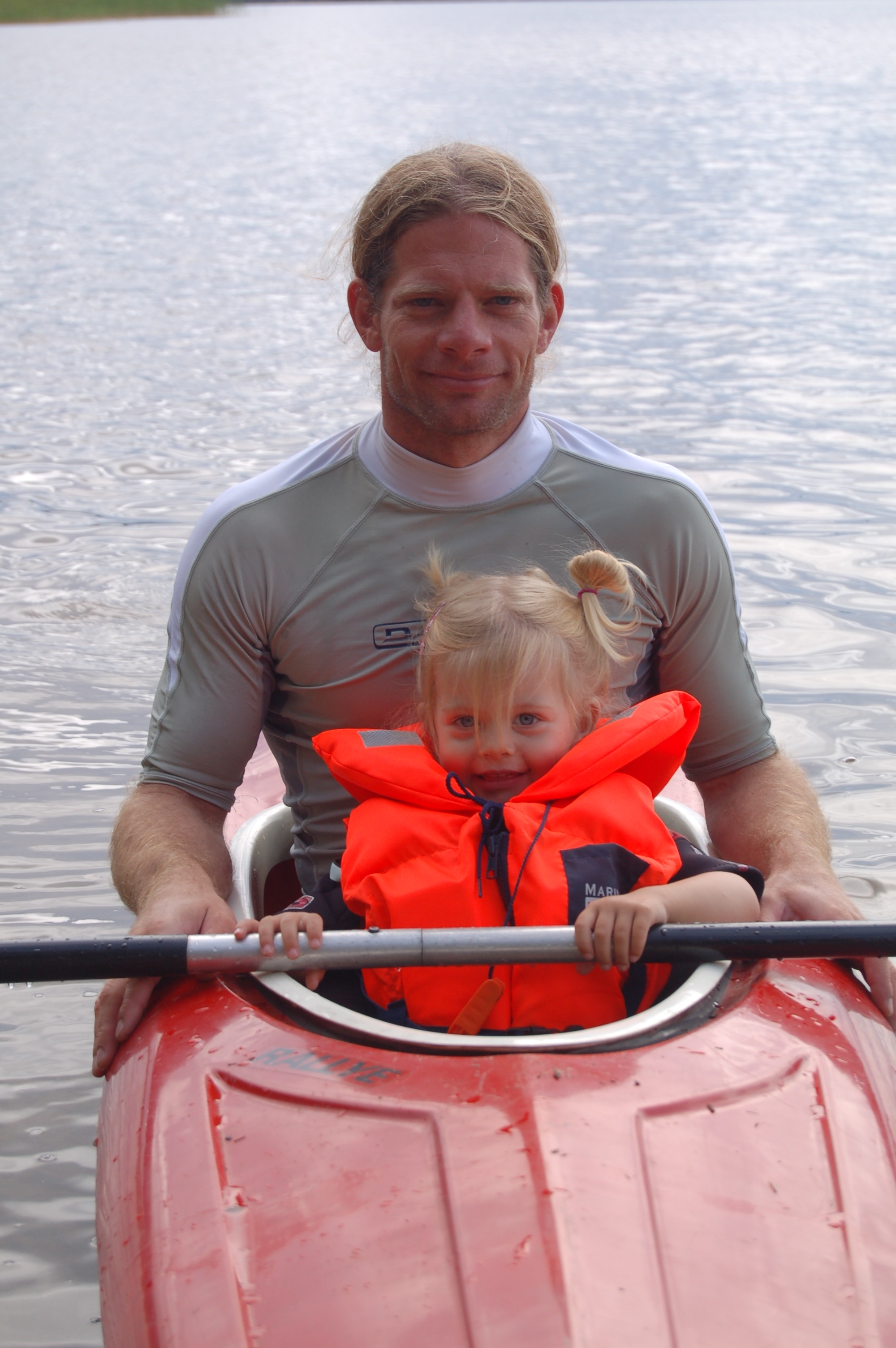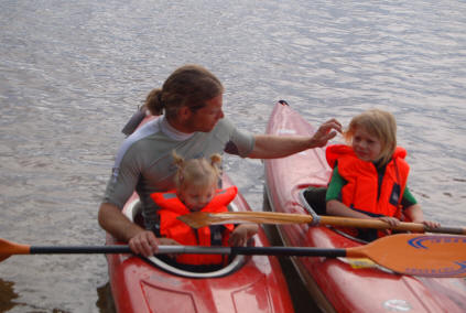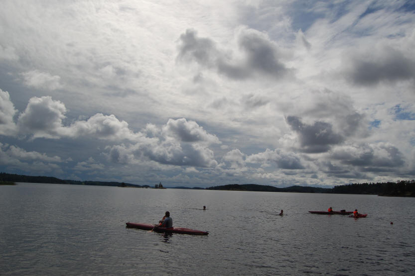 Inzwischen ist es 19 Grad C warm und bedeckt, regnet aber nicht mehr. Die Jungs sausen ab und sind über 1 Stunde im See am Baden. Wir schaffen es nicht sie zu überreden aus dem Wasser zu kommen. Birgit badet mit und wäscht sich im See. Christian und Kirstin paddeln mit unseren Booten auf dem See.
