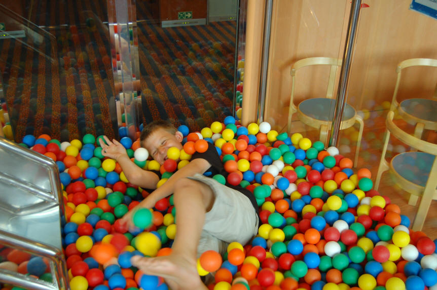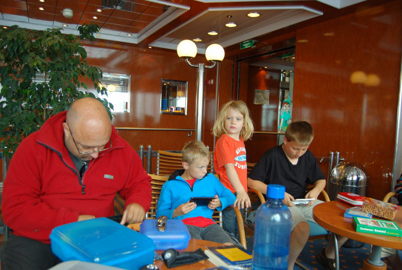 Enttäuscht sind wir davon, dass die Fähre keine Aufenthaltsbereiche für Selbstversorger bietet, es gibt einen Haufen Restaurants, Bars und Shops, aber keine einfachen "freien Sitzbereiche" Wir fragen an der Rezeption, uns wird gesagt, wir dürften in der Bar sitzen,- nur ab 18 Uhr ist hier Programm. Leider beginnen ab 9 Uhr die Soundchecks und es dröhnt die Countrymusic um uns, brr. Ich suche das ganze Boot nach einem anderen Aufenthaltsort ab, Fehlanzeige. Es gibt 3 Restaurants und eine Disco, eine Bar (dort sitzen wir) und eine Pianobar. In allen ist ein Heidenkrach, bei uns startet das "Kinder-Karaoke" in ohrenbetäubender Lautstärke. Für die kleineren Kinder gibt es extra Ohrenschützer, damit sie nicht weinen von dem Krach.- Unglaublich, warum muss Musik immer so laut sein?