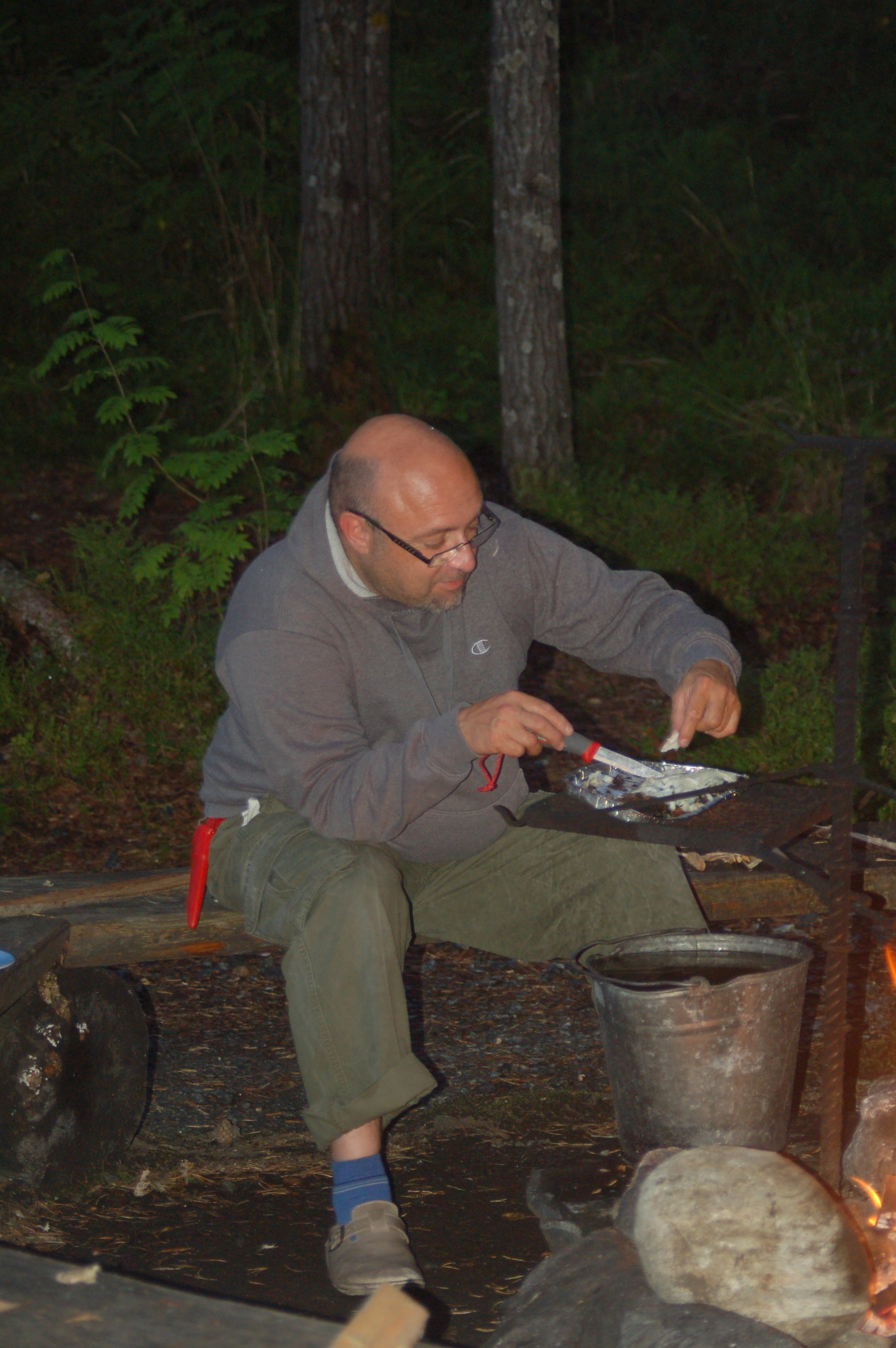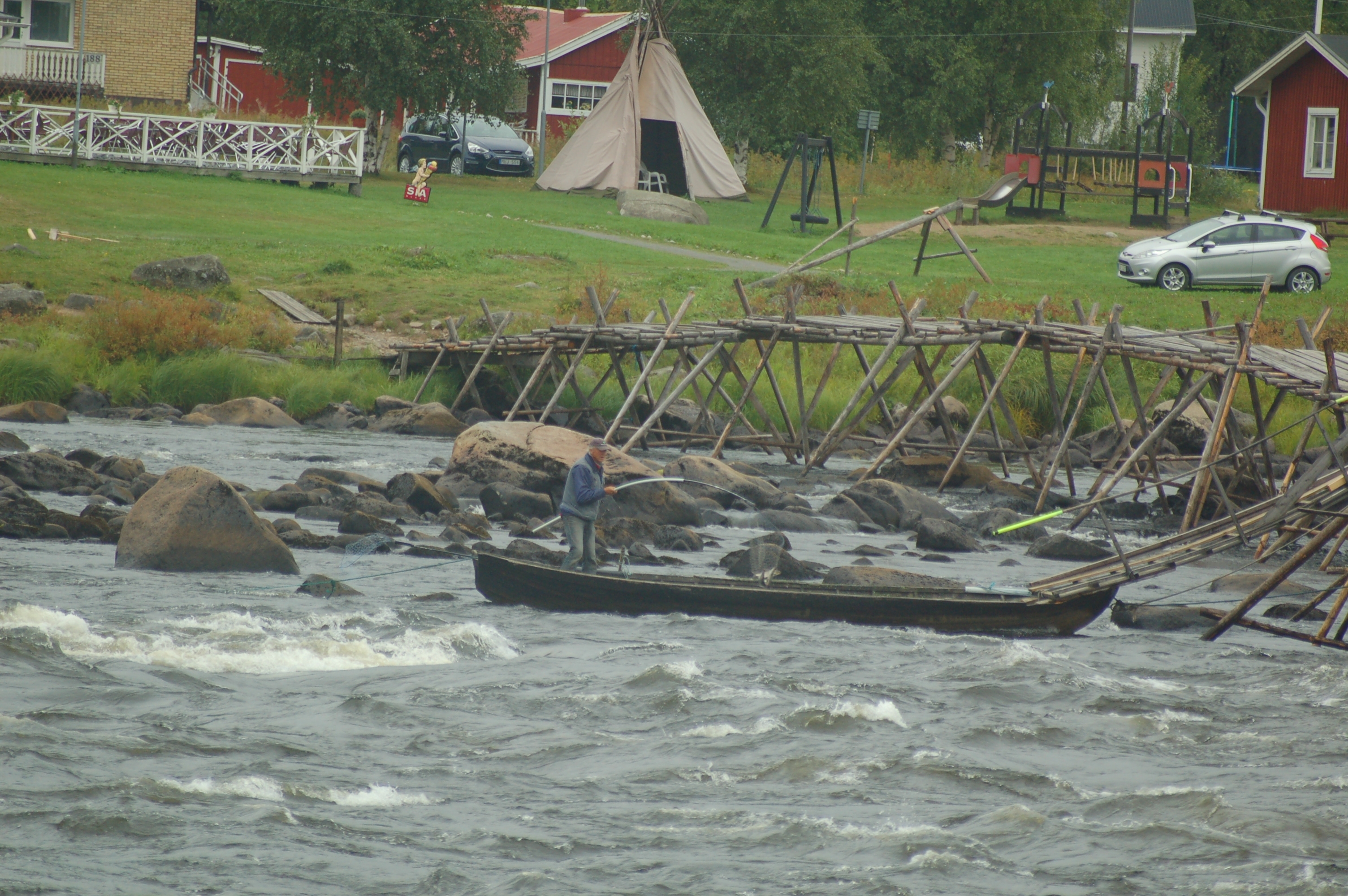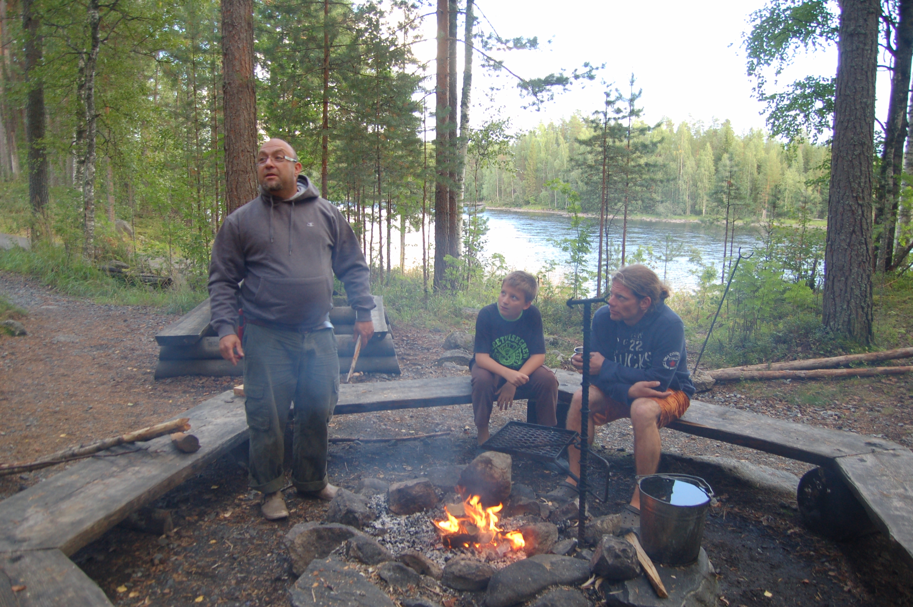 Klaus fährt mit Anna los und informiert sich über die örtlichen Wildwassermöglichkeiten. Am Abend teilt er uns via SMS seinen Standort mit und mit einigen Schwierigkeiten (falsche GPS-Daten, Funklöcher, ausfallendes Navi etc.) stoßen wir wieder zu ihm. Der Standort bietet ein Klohaus, Mülleimer und einen Lagerfeuerplatz mit Picknicktisch und Eisengeschirr (Pfannen, Töpfe) um über dem selbst entzündeten Lagerfeuer zu kochen. Außerdem ist in einem Schuppen ein großer Holzvorrat und sogar ein Hackklotz mit Beil! Klaus wird von einem finnischen Angler ein großer Fisch geschenkt, den er Abends auf dem Lagerfeuer grillt. Wir sitzen trotz der erstmals gehäuft auftretenden Schnaken am Feuer zusammen, ehe wir alle müde ins Bett fallen.