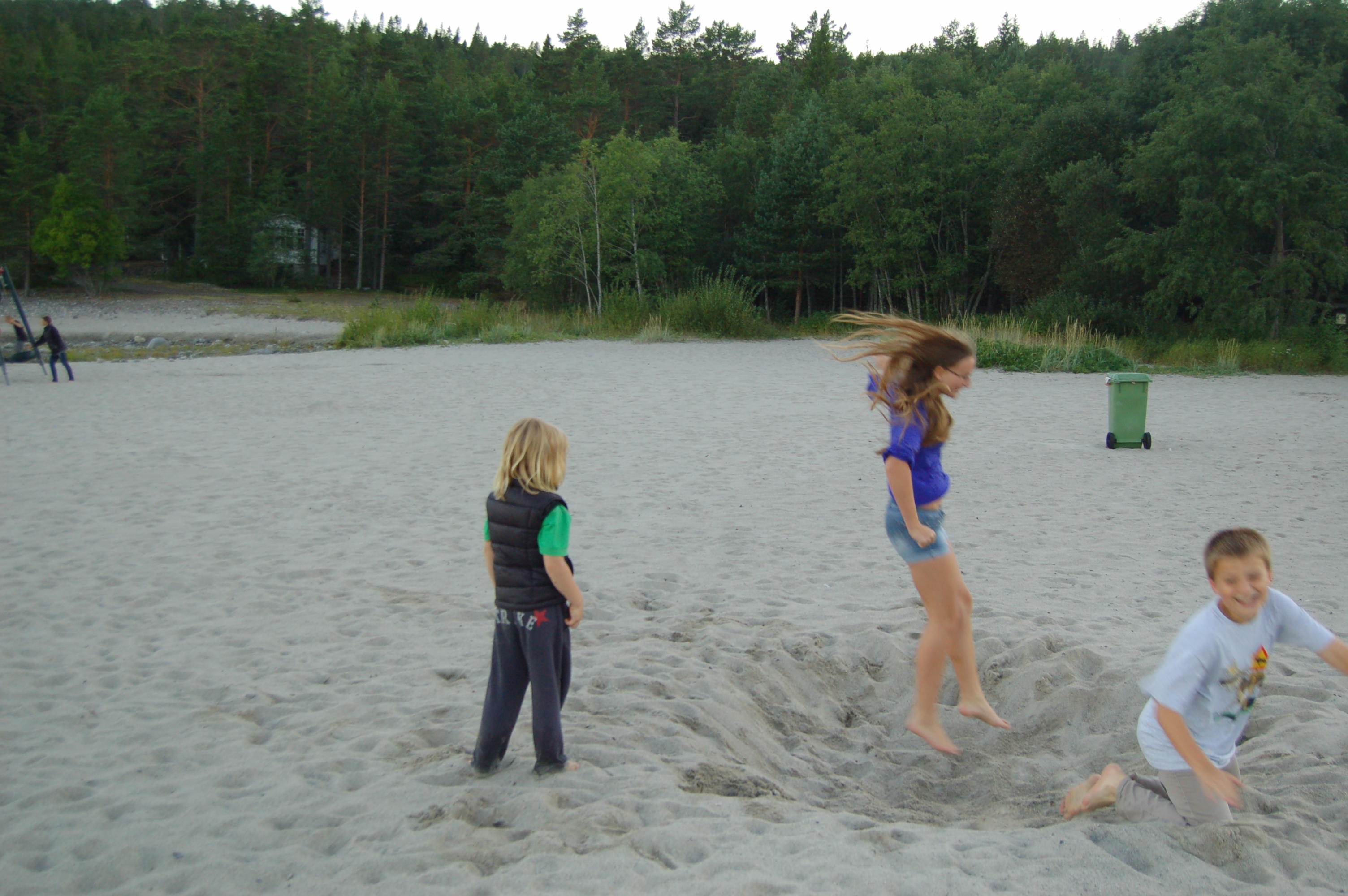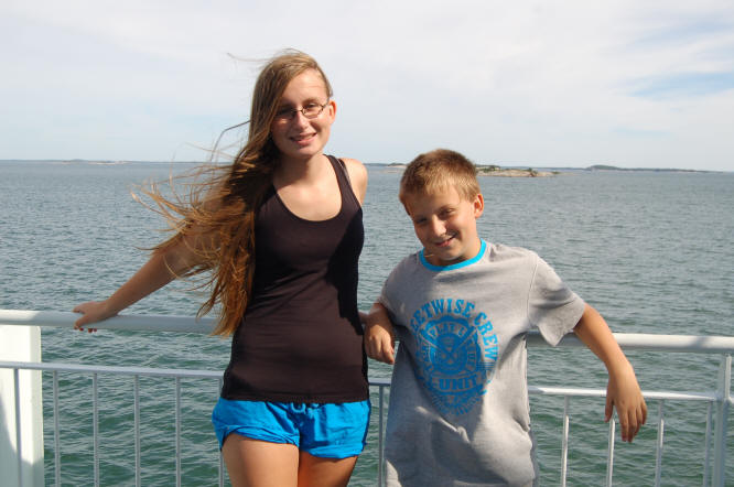 Wir fahren weiter, bis nach Lieksa, dort zum Fähranleger. Diesen erreichen wir in der Mittagszeit und das Wetter klart wie auf Bestellung auf. Die Kinder entdecken ein Volleyballfeld und stürzen los zum Volleyballspielen. Christian schließt sich an und zerschießt sich selbst versehentlich seine rahmenlose Brille, so ein Pech!