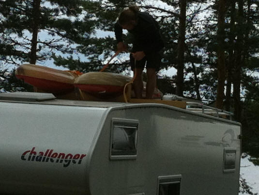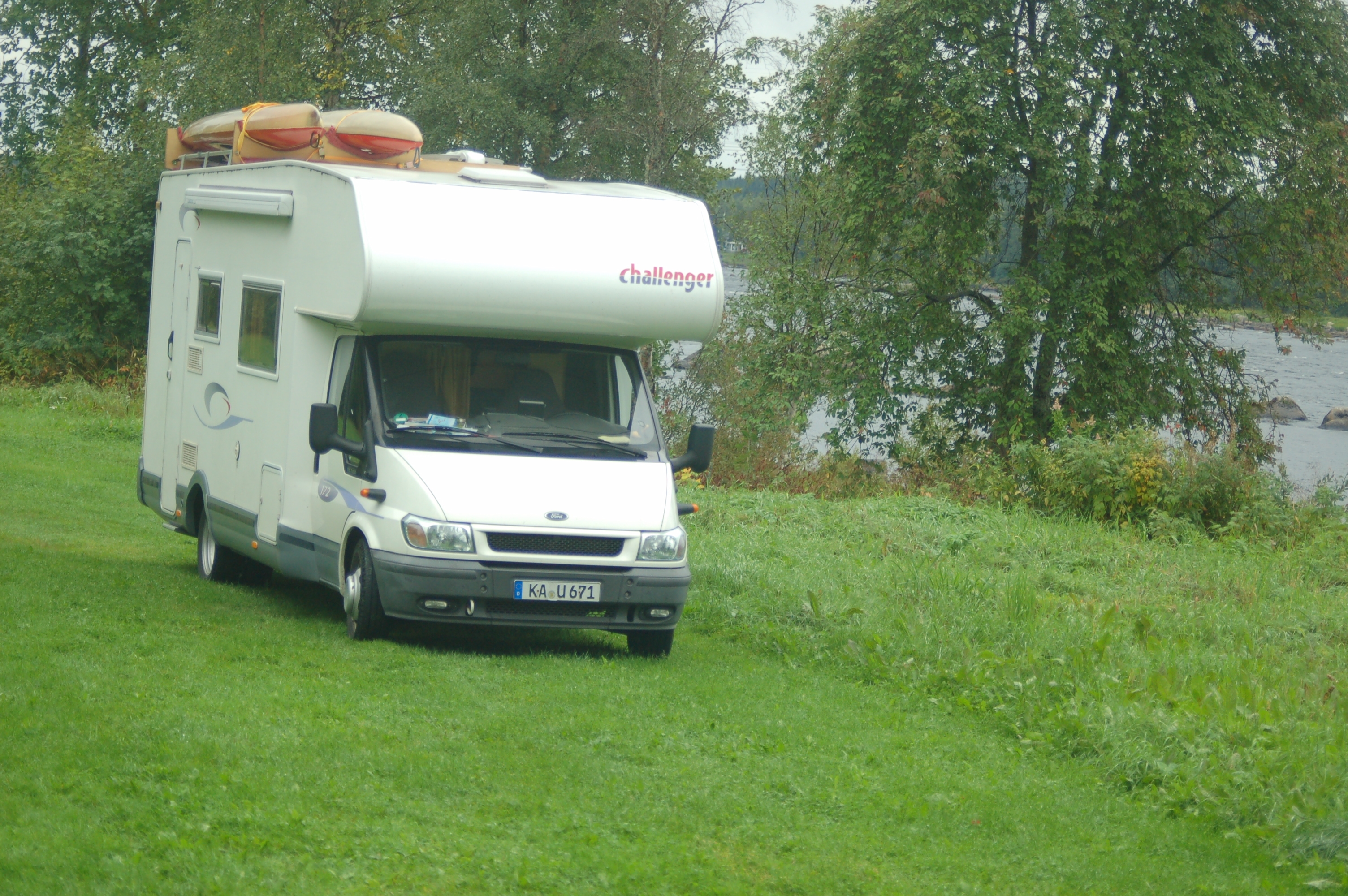 Nach dem Frühstück fahren Klaus, Anna Christian, Fabian und ich mit Klaus Wohnmobil ca. 20km flussaufwärts. Dort setzen die 3 die Kanus ein und begeben sich auf ihre Wildwasserabfahrt bis zu ihrem Ausstiegspunkt, unserem Stellplatz. Es dauert eine 3/4 Stunde bis alle 3 die Ausrüstung angezogen haben, unglaublich was man da alles braucht und gut dass Christian und Klaus in etwa eine Körpergröße haben, so lässt sich aus Klaus Reservesachen eine Ausrüstung für Christian zusammen stellen. Ein weiteres Kanu hat Klaus ja auch dabei. Währenddessen gießt es in Strömen. Nachdem die 3 gestartet sind, fahren Fabian und ich das Womo von Klaus wieder zurück zum Stellplatz. Unterwegs ruft Heike an, sie macht sich Sorgen, weil wir so lange weg sind. Als wir am Stellplatz wieder ankommen, ist es schon fast Zeit zum Mittag. Es regnet den ganzen Tag in Strömen und so verbringen wir den Tag im Womo mit Lesen, Spielen und Filmschauen, ich schreibe Reisebericht und checke die mails.