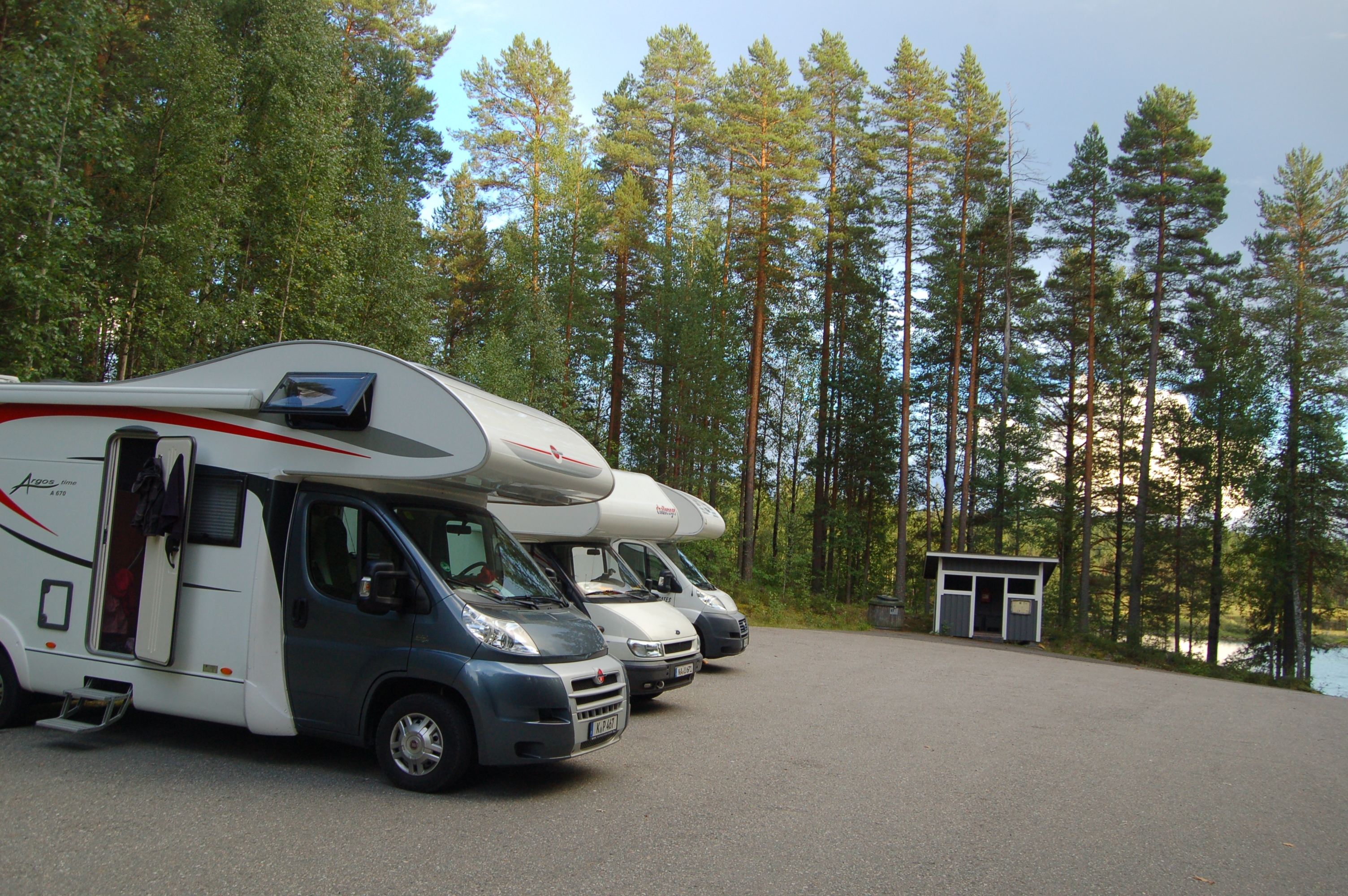 Wir überlegen, ob wir hier bleiben sollen zum Übernachten, was im Grunde sicher möglich wäre. Unser Reiseführer schreibt von einem tollen Picknickplatz mit Feuerstelle, Toilettenhaus etc. Aber entweder sind die GPS-Daten falsch angegeben, oder es gibt den Platz nicht mehr. Wir suchen weiter nach einem Übernachtungsplatz. Das Problem, das wir haben, ist mal wieder der viel zu kleine Dieseltank des Transit, obwohl wir in Lieksa vollgetankt haben, beträgt unsere Restreichweite nach nun über 300km nur noch ca. 100 - 150 km. Tankstellen waren unterwegs nicht allzu viele bis gar keine. Bis Kuusamo sind es noch rund 80 km. Daher wollen wir keine großen Umwege mehr machen, die Ducatofahrer schütteln ihr Köpfe, Christian kommt mit einem vollen Tank über 1200km, wir max. 500. Wir finden an der Straße 5 einen schönen Rastplatz am Wasser, dort stellen wir uns für heute hin. Der Platz bietet außer der Sicht aufs Wasser einen Mülleimer und Millionen von Schnaken, sonst nicht viel. Wir essen zu Abend und trinken im Auto ein Bier. Dann gehts ins Bett.