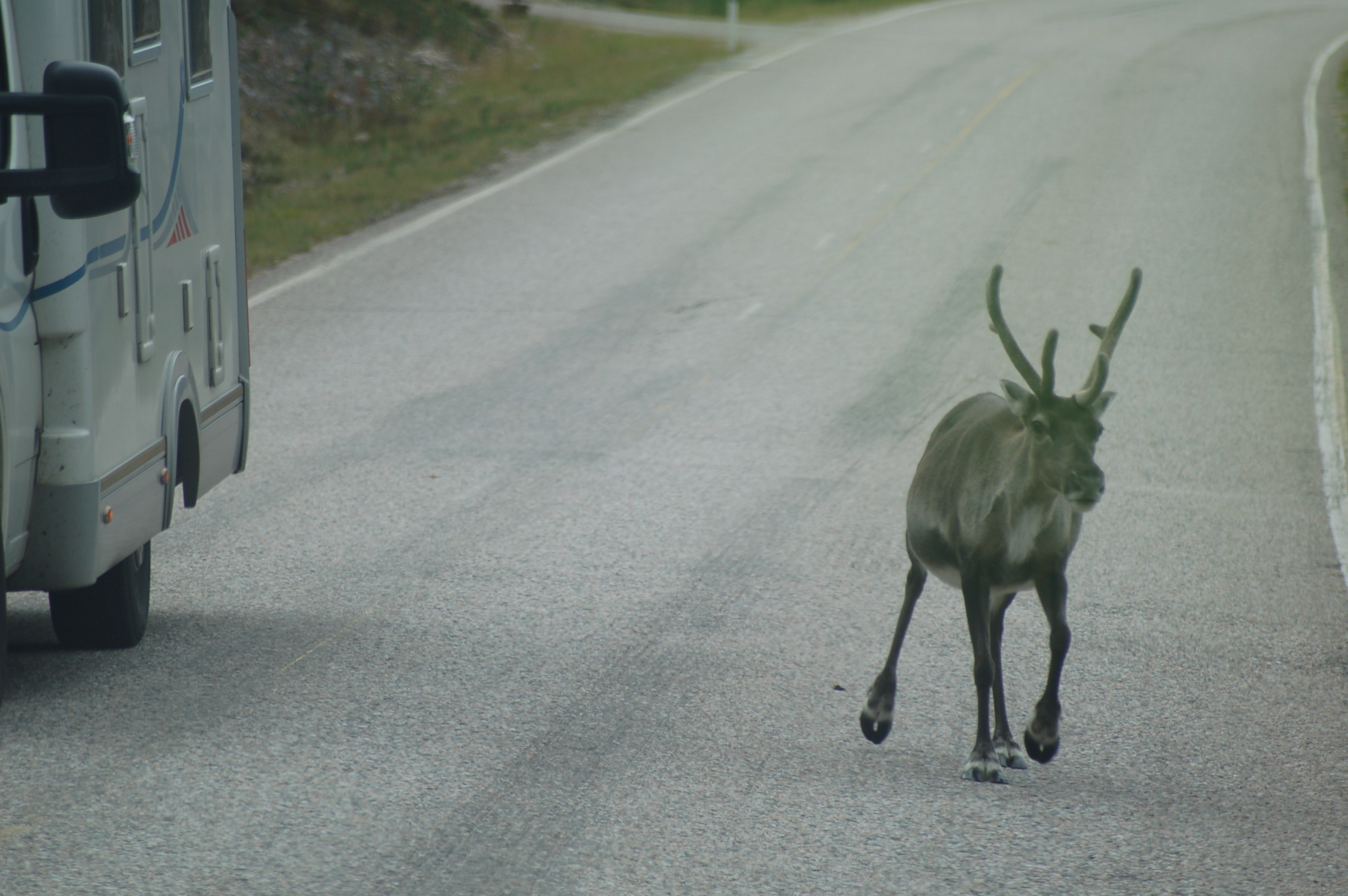 Wir fahren weiter, heute wollen wir bis Ranua und dort den Zoo besuchen. Zuerst aber tanken wir in Kuusamo 60 Liter Diesel und Frischwasser. Dann gehts weiter. Auf der Fahrt stehen immer wieder Rentiere auf der Fahrbahn oder laufen unvermutet auf diese. Einige Male müssen wir scharf bremsen und anhalten, um die Tiere passieren zu lassen. Klaus hat sich in unserem Konvoi weit zurück fallen lassen und ihm rennt eines dieser Tiere so knapp vor den Kühler, dass er nur noch ausweichen kann. Sein Auto kommt ins Schleudern und droht umzukippen. Ein gehöriger Schreck für Familie Zanker!