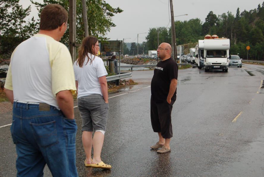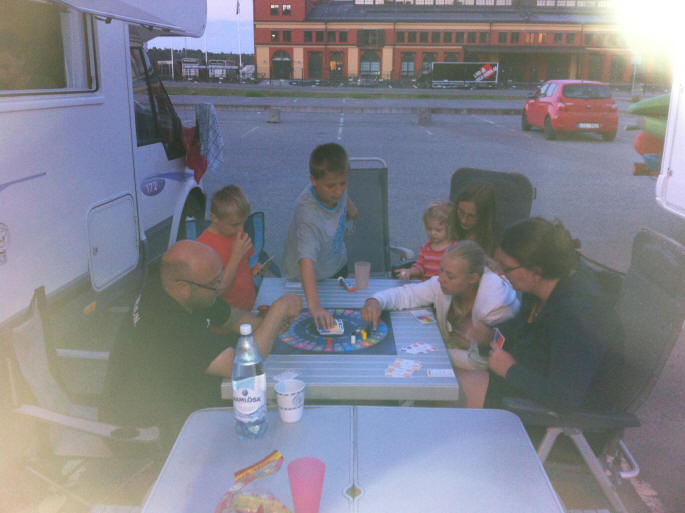 Die Kinder gehen zum nahegelegenen Badeplatz und baden. Leider stellt sich heraus dass im Ufersand Öl oder Teer sind, mühsam reinigen wir die Beine, nun ist uns die Lust aufs Baden vergangen. Schade, das hatten wir nicht erwartet im ansonsten sauberen Skandinavien. Am Abend fahren wir auf Klaus Wunsch an den Fähranleger. Dort sitzen wir zusammen vor den Womos, trinken ein kühles Bier und spielen "Stille Post mit Bildern". In der Nacht gewittert es und es regnet.