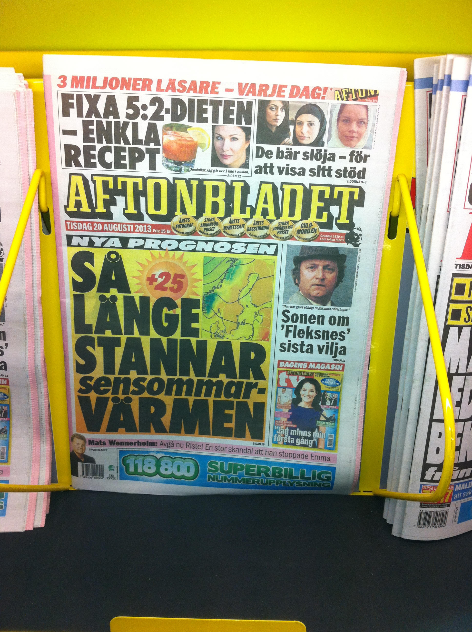 Gegen 11 Uhr sind alle zurück und wir nehmen die ca. 370km bis zum Stellplatz nach Sala in Angriff. Unterwegs entsorgen wir an der E 4 am Luxusklohaus, an dem es sogar Frischwasser gibt. Mittagessen gibts auf ausdrücklichen Wunsch der Kinder ausnahmsweise bei MC Donalds. Gegen 17 Uhr treffen wir in Sala ein, die Kinder stürmen ins Wasser und springen vom 2m Sprungturm. Christian natürlich vom 5m Plateau. Danach spielen die Kinder zusammen mit Klaus Beachvolleyball. Es ist wunderbares Wetter, fast 25 Grad C und Sonnenschein. Der örtlichen "Bildzeitung" ist das Wetter sogar eine Riesenschlagzeile wert: