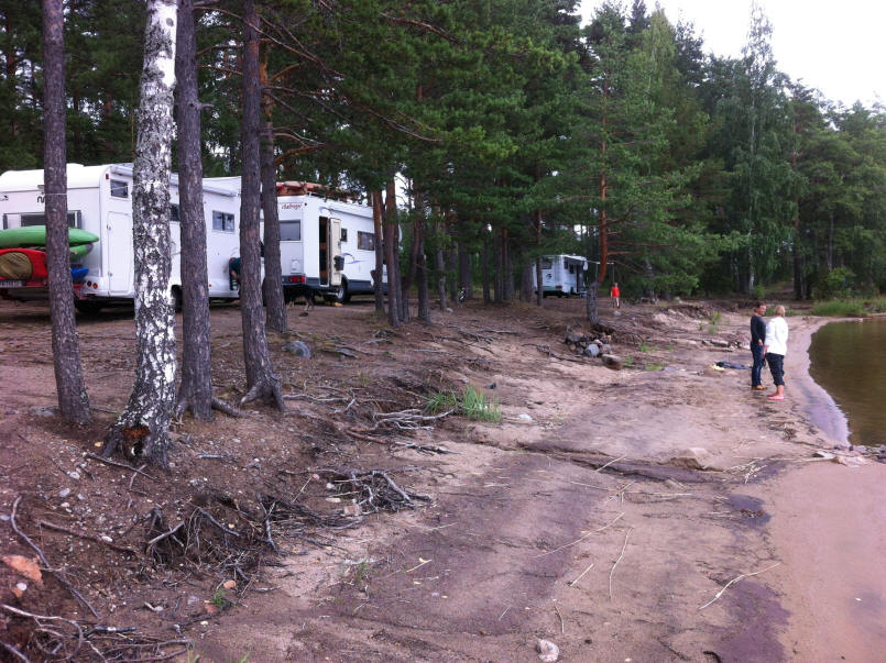 Alle genießen das schöne Wetter, das 21 Grad C und Sonnenschein bietet. Die Kinder wollen eigentlich baden, zucken aber entsetzt zurück, das Wasser ist sogar ihnen zu kalt. Am Abend beratschlagen wir den weiteren Tourenverlauf. Zankers haben noch ein halbe Woche länger Urlaub als wir und wollen sich daher in Mittelschweden von uns verabschieden. Wir beschließen als morgiges Tagesziel den Stellplatz in Sala, den wir von unserem letztjährigen Schwedenurlaub kennen. Sprungturm, Volleyballfeld und der dortige See sind gute Argumente dafür.