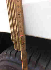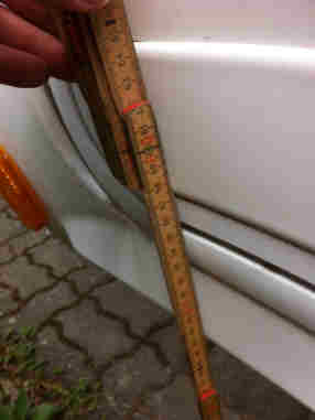 auch beim Kochen ist das ganze sehr nervig. Rechts seht Ihr den Messaufbau mit 2m-Wasserwage. Bezogen auf 2m ergeben sich ca. 8 cm Höhendifferenz, bezogen auf den Radstand dann insgesamt ca. 12 cm. Fahre ich bei ebenem Boden mit der Vorderachse auf die gelben Unterlegkeile, steht das Womo immer noch nicht gerade. |